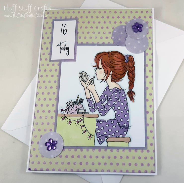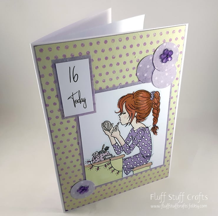 The image has been framed in lilac handmade paper and overlaid onto a lime green and purple spotted background. Coordinating polka dot card has been used to create circular corners embellishments with added flower gems. The sentiment reads: '16 Today'