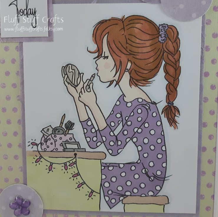Handmade 16th birthday card, featuring a hand coloured image of a girl putting her make up on.