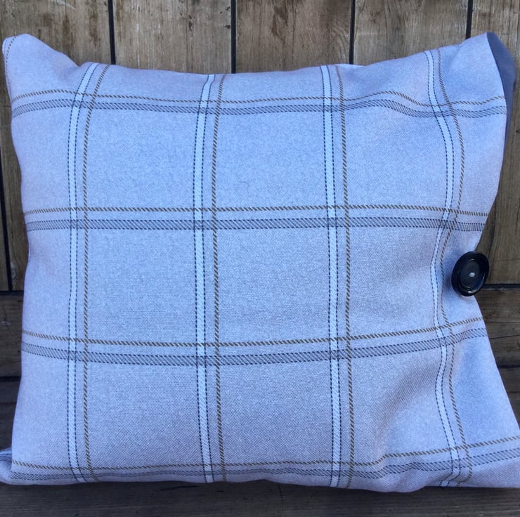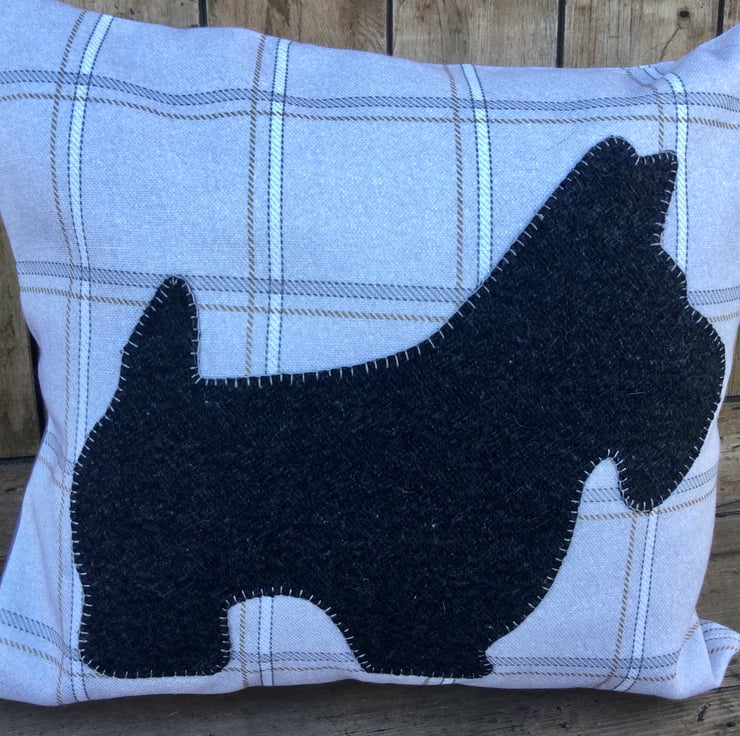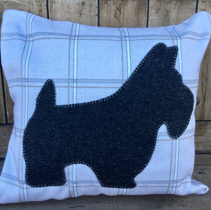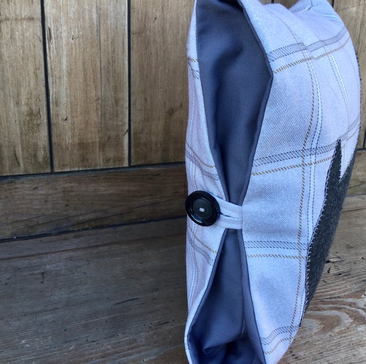 Cushion in a grey and cream check with a little terrier dog design made from a soft black wool blend fabric which has been repurposed from a coat. The cushion has a grey contrast lining and a large vintage button clasp instead of a zip. Handmade in Wales. Measures approx 40 x 40 cm. This is being sold on Seconds Sunday as part of stock clearance