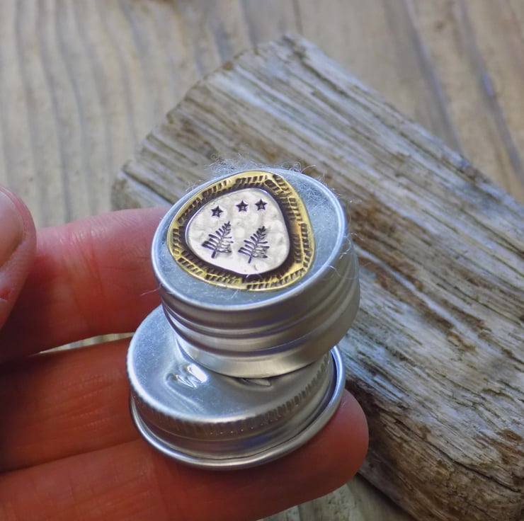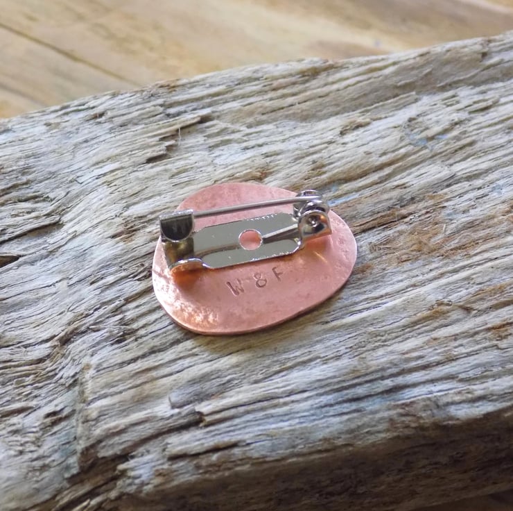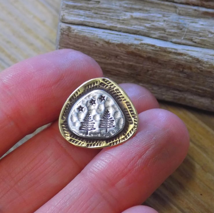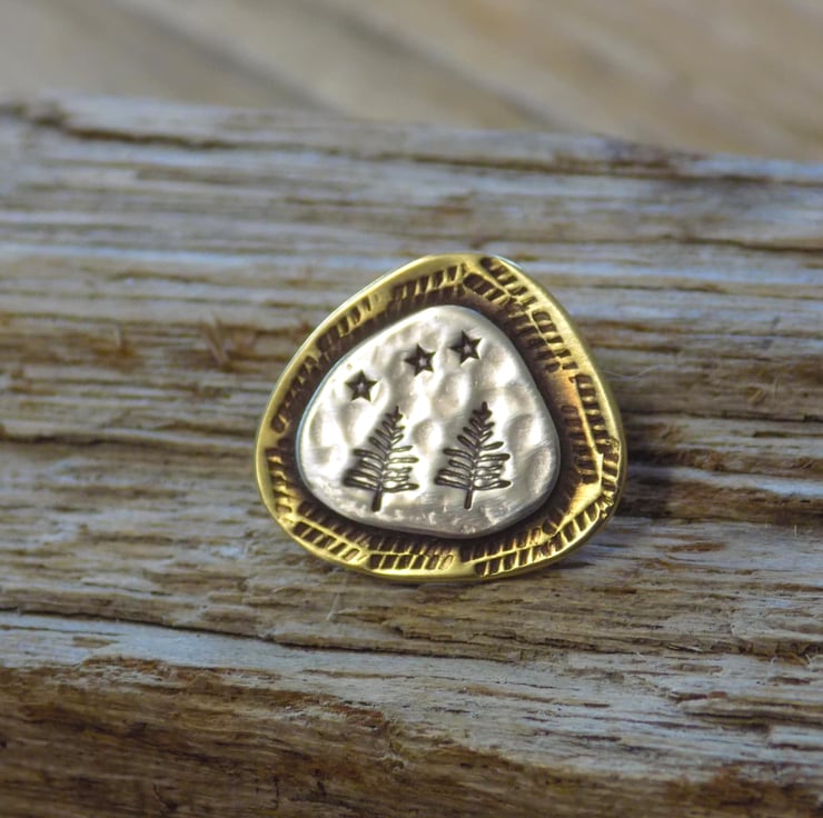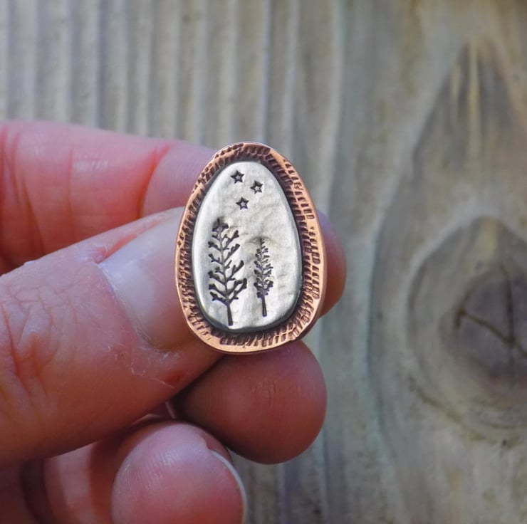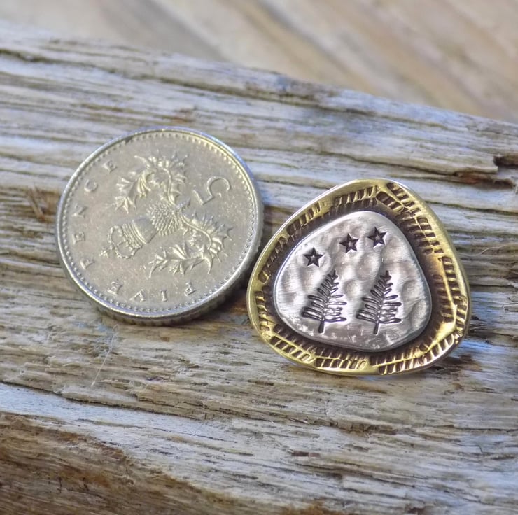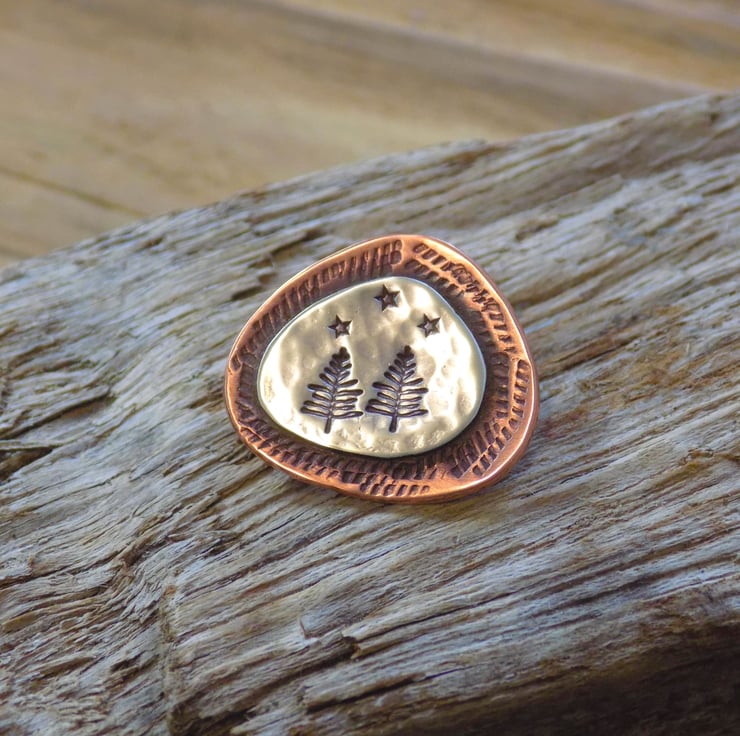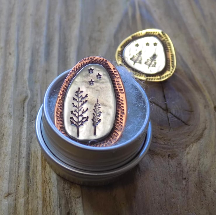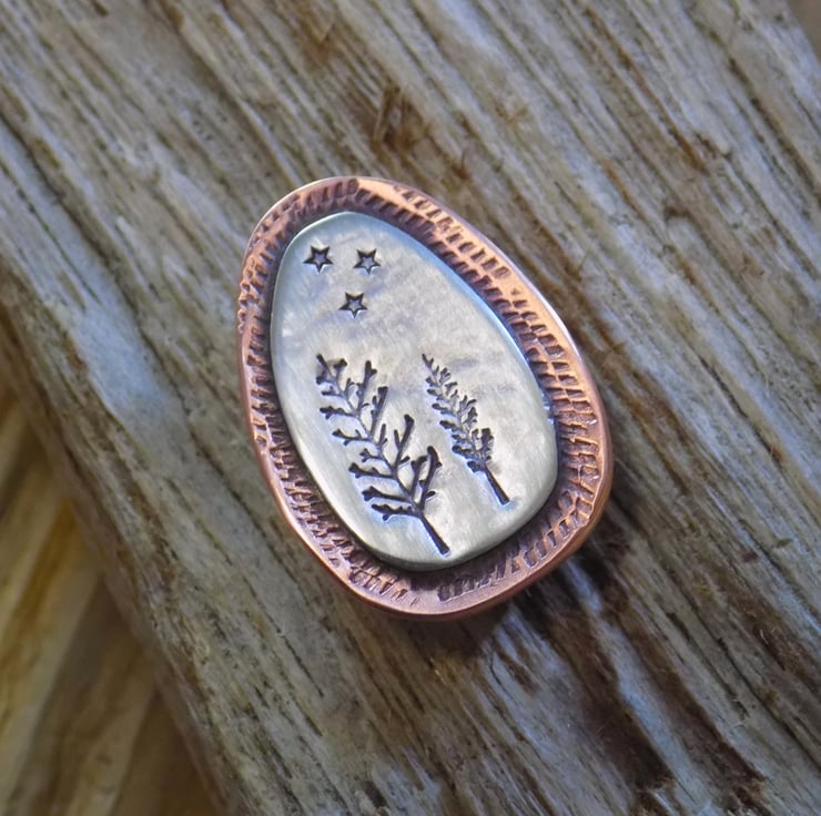 Made from either copper and sterling silver or brass and sterling silver sheet. A small layer of silver has been carefully soldered to the front of the copper /brass. The silver has been given a little texture, some trees and tiny stars. These are the smallest pieces of mixed metals designs I have made, but they are really very cute and unique and would look perfect on a jacket lapel , bag, cardigan or jumper! A small but very sturdy brooch setting with a catch has been fixed to the back with strong jewellers glue.