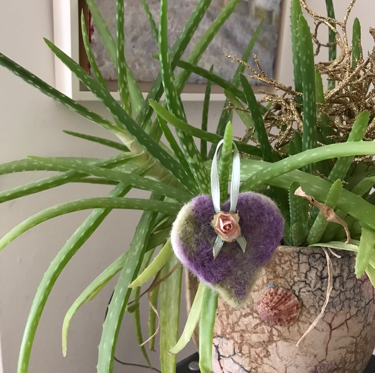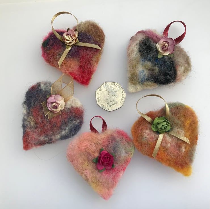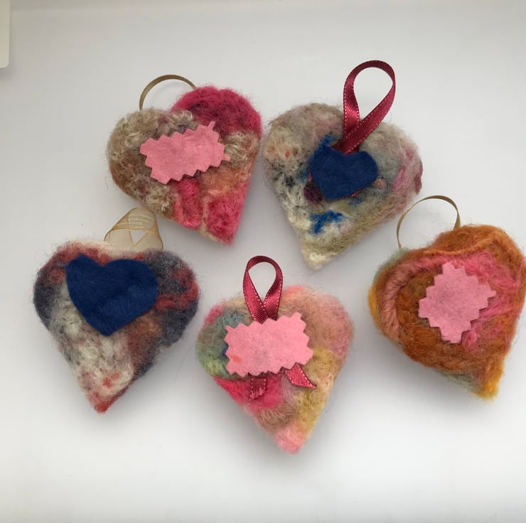 A set of 5 needle felted heart shaped decorations for attaching to gifts, or hanging on the xmas tree, or you can insert into celebratory cards.