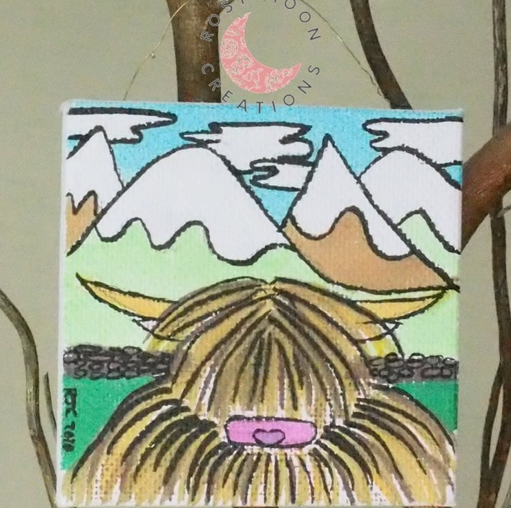 7x7cm canvas with a hand drawn Highland Cow makes an ideal gift for any occasion.