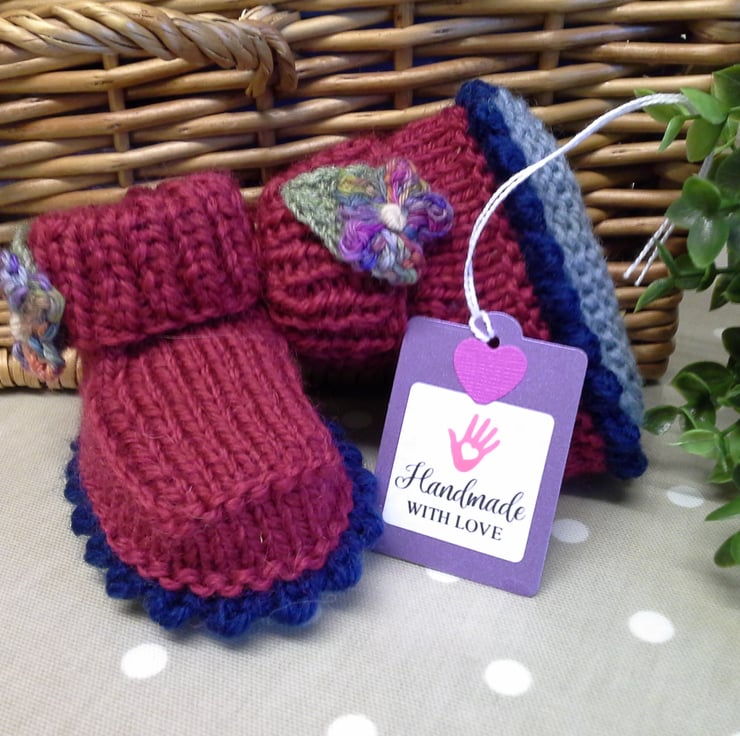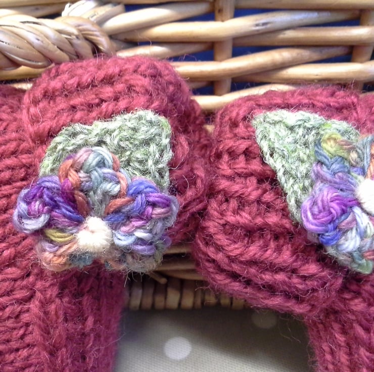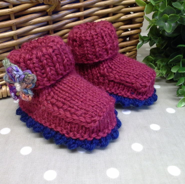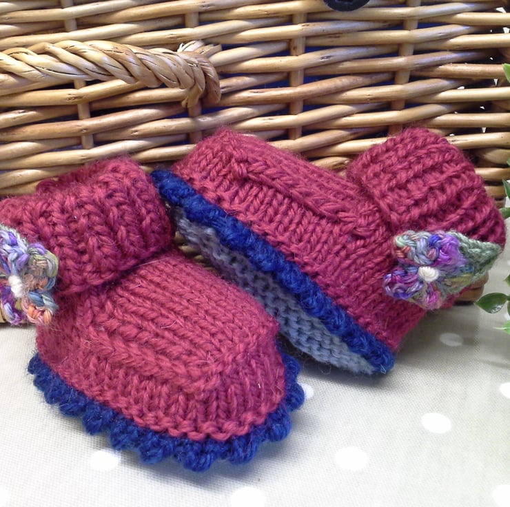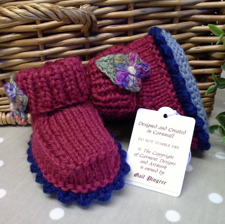 A beautiful pair of baby girl's booties designed and hand crafted in Cornwall using the famous branded machine washable pure Marino wool aran weight yarns. For the hand crocheted flowers a designer's hand dyed Marino wool and nylon mixed yarn has been used. The hand crocheted green leaves are fine 4 ply 'Jaeger' yarn.