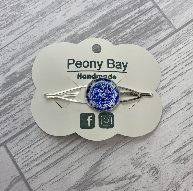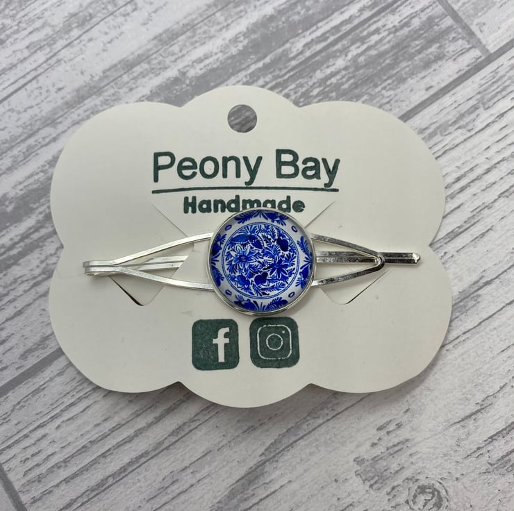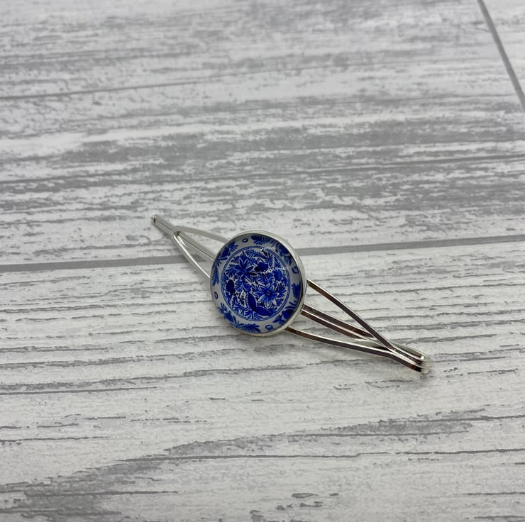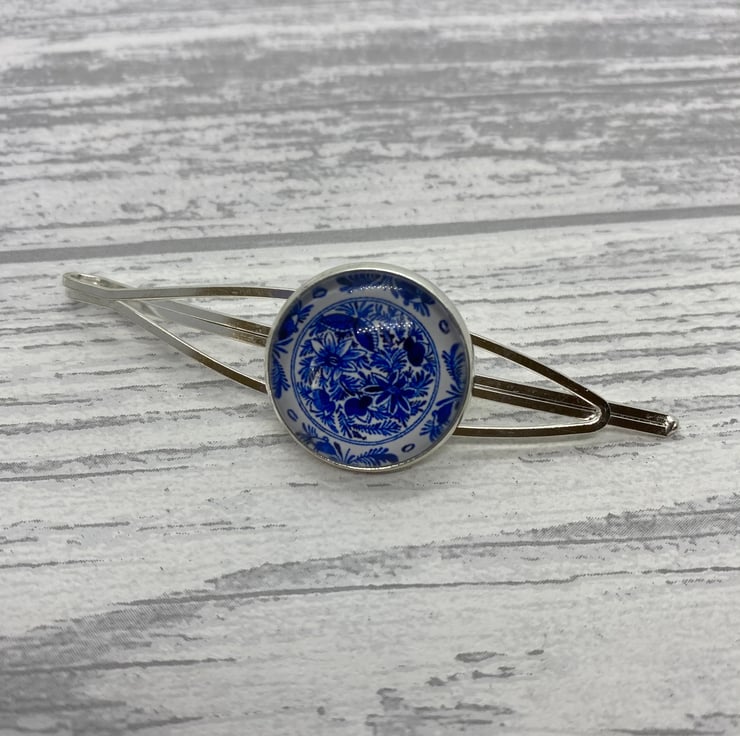 This is a beautiful hair clip / hair slide that is reminiscent of vintage blue and white pottery. It has a pretty floral design in blue on a white background, and is on a silver tone clip.