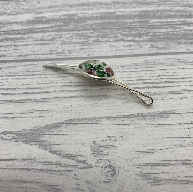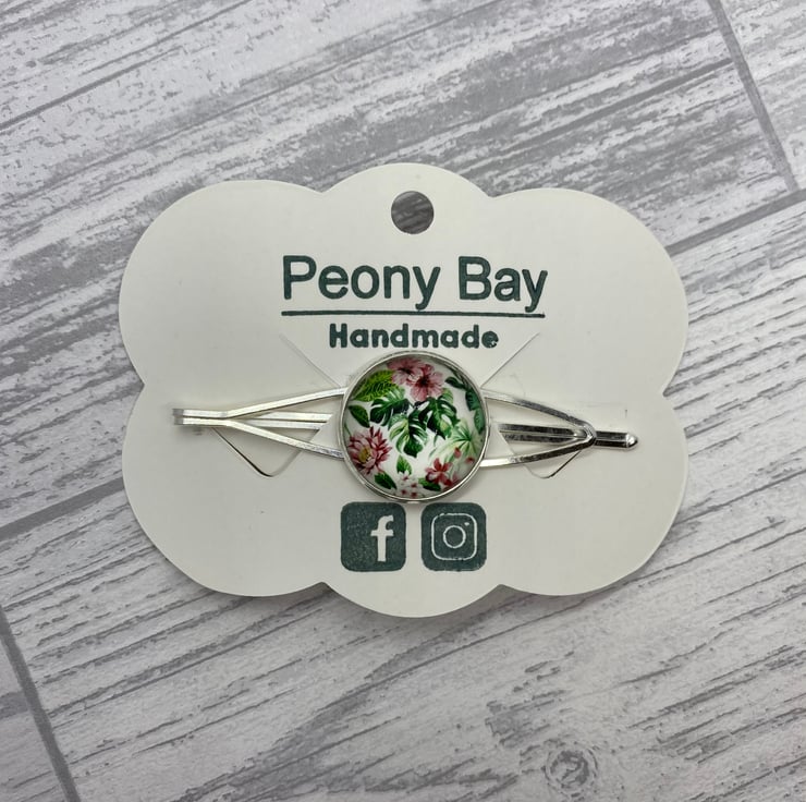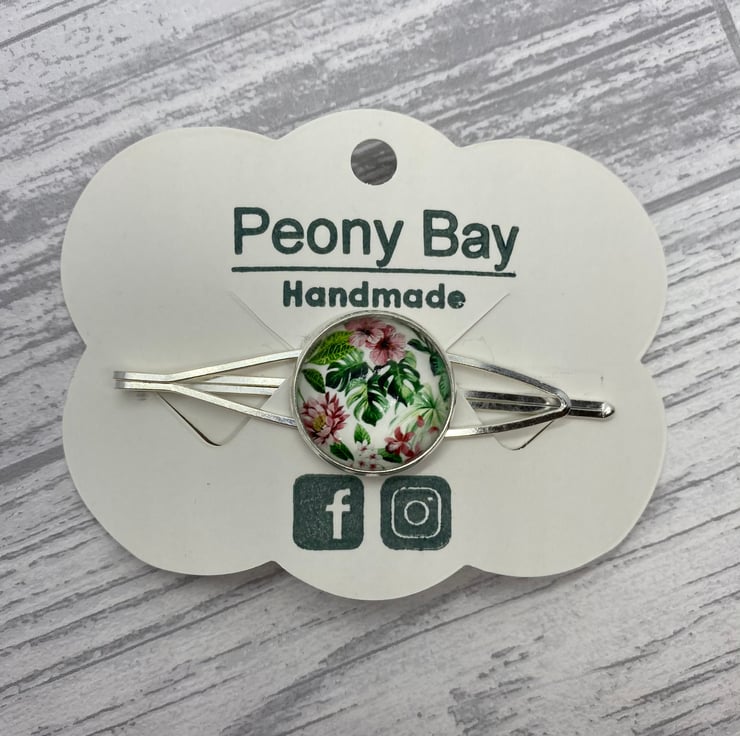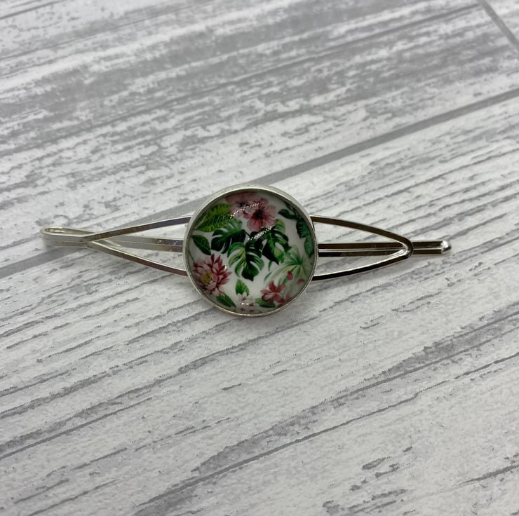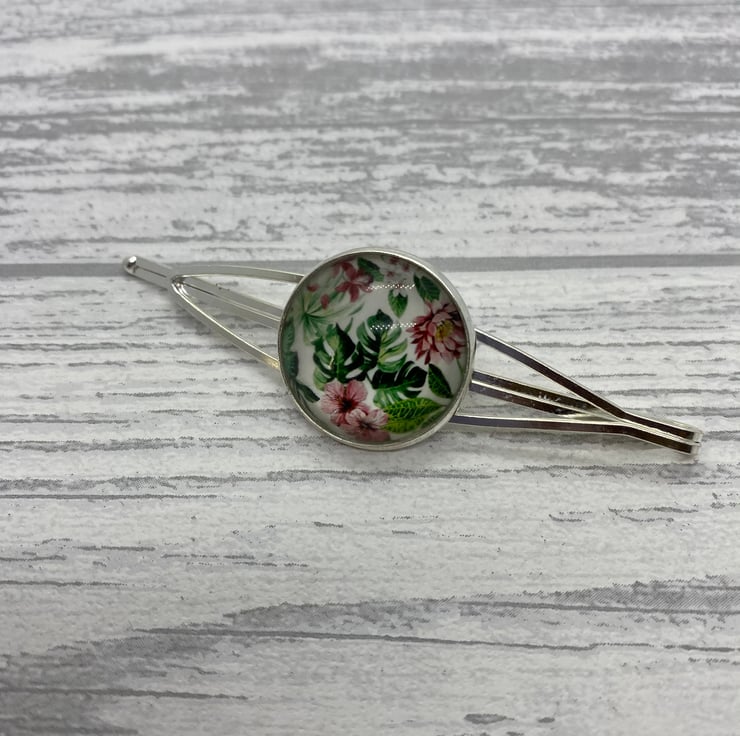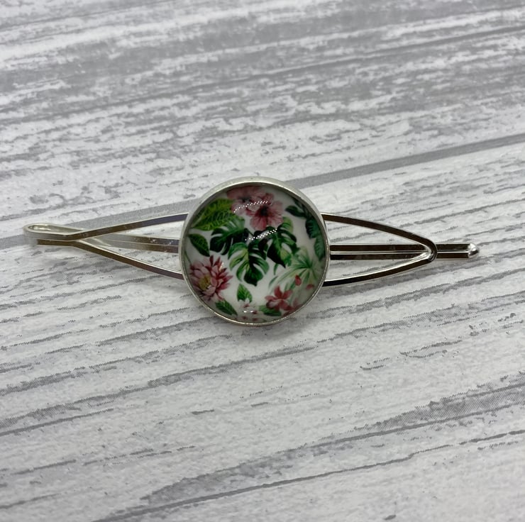 This is a beautiful hair clip / hair slide with a tropical print. The pretty floral design features pink flowers and green leaves on a white background, and is set on a silver tone clip.