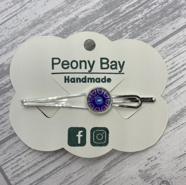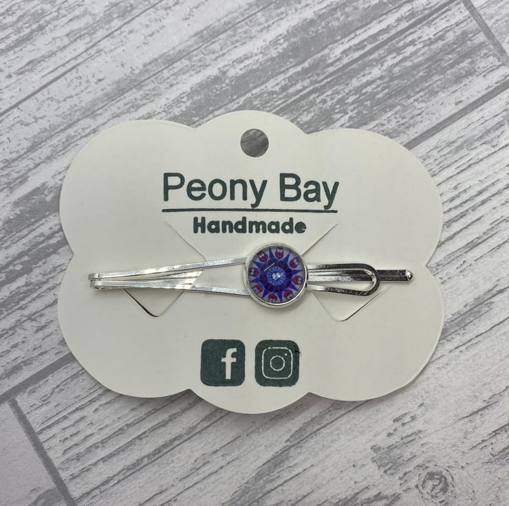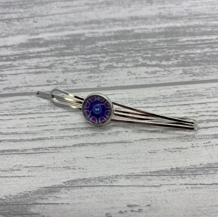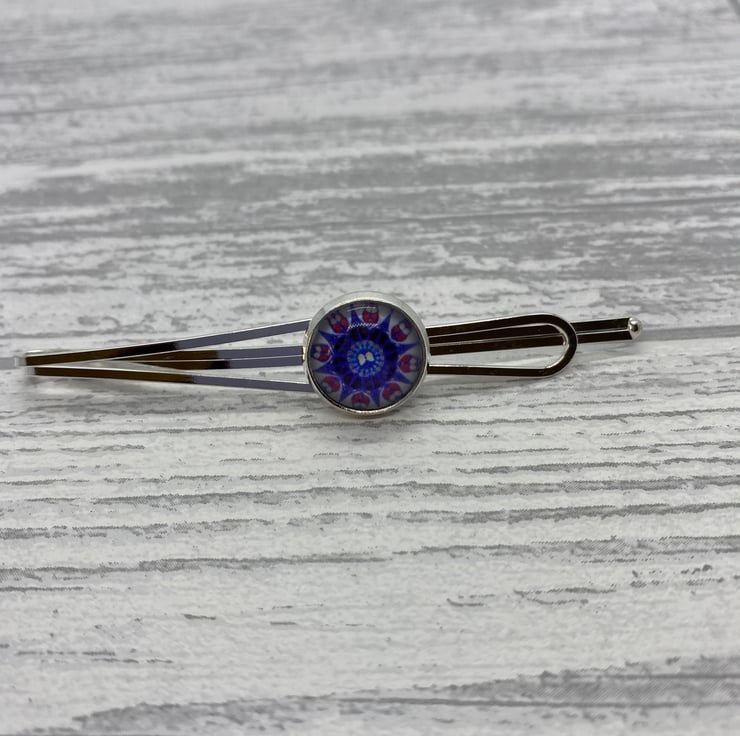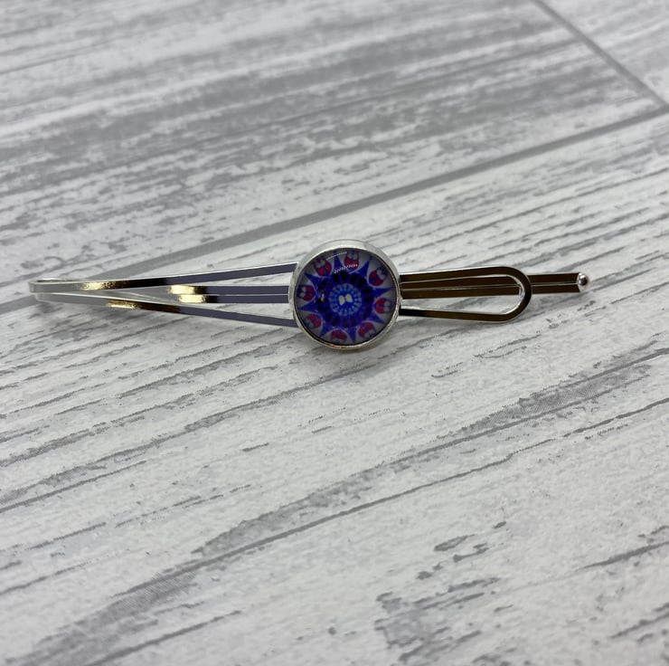 This is a beautiful hair clip / hair slide that has an Art Deco feel. It has a pretty mandala design in purple and pink on a white background, and is on a silver tone clip.