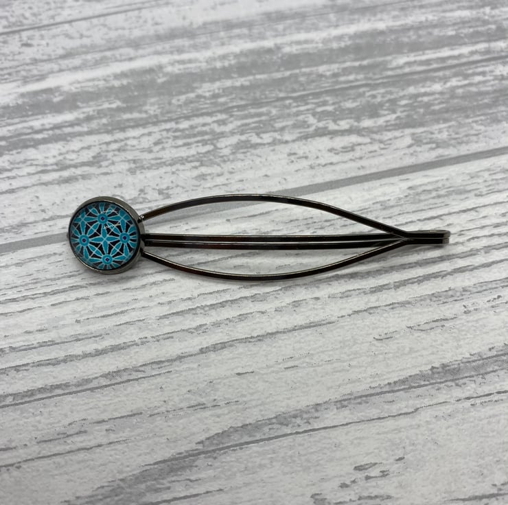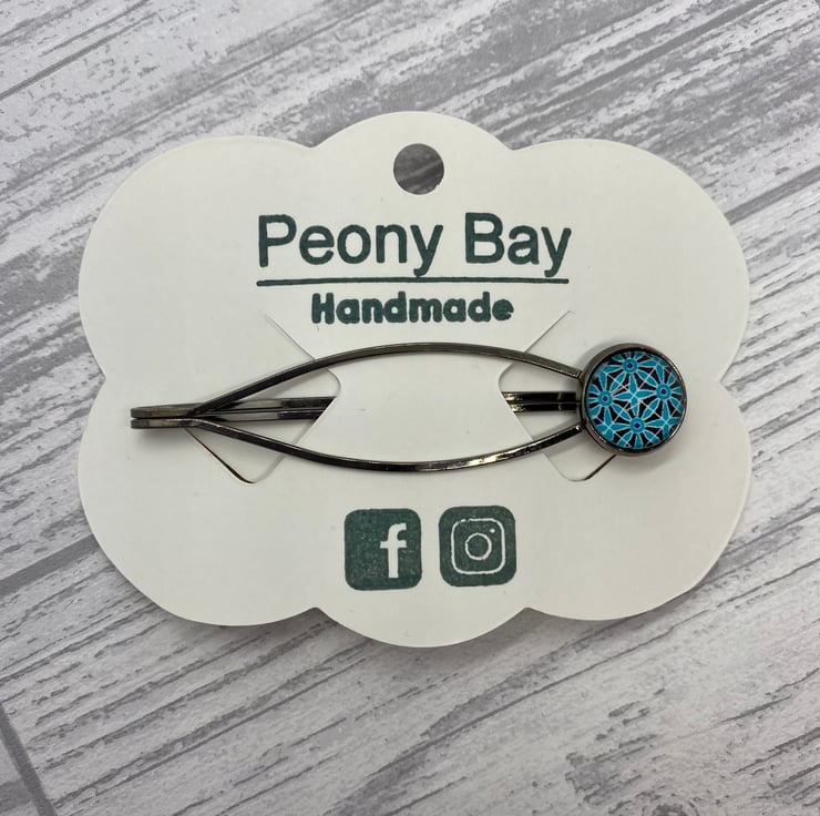 This is a beautiful hair clip / hair slide. It has a pretty mandala / floral print in blue, white and pink on a black background, and is set on a black tone clip.