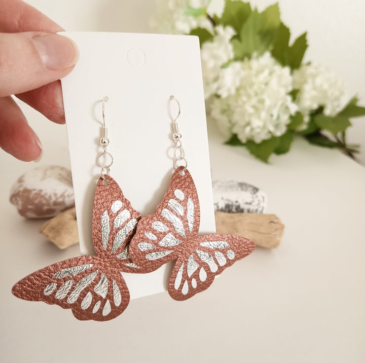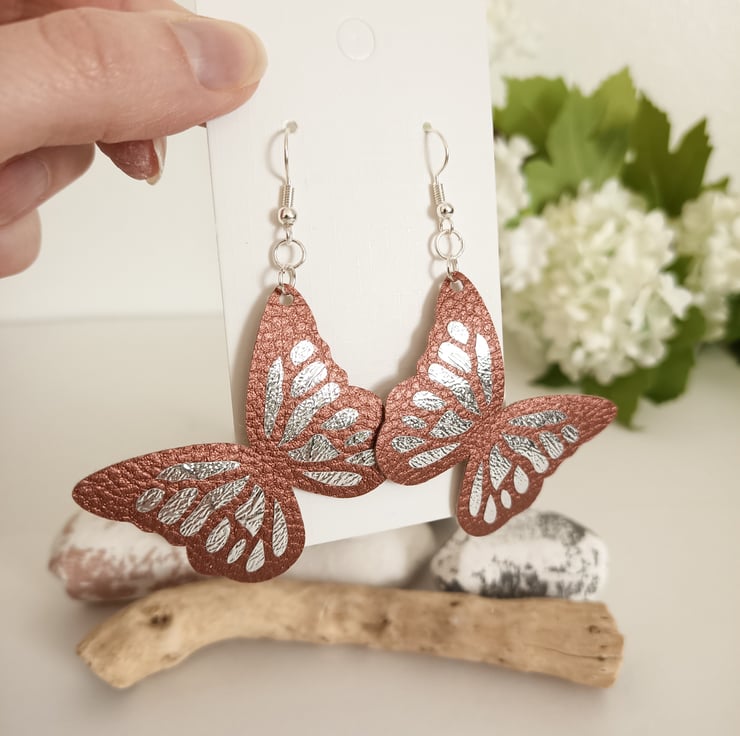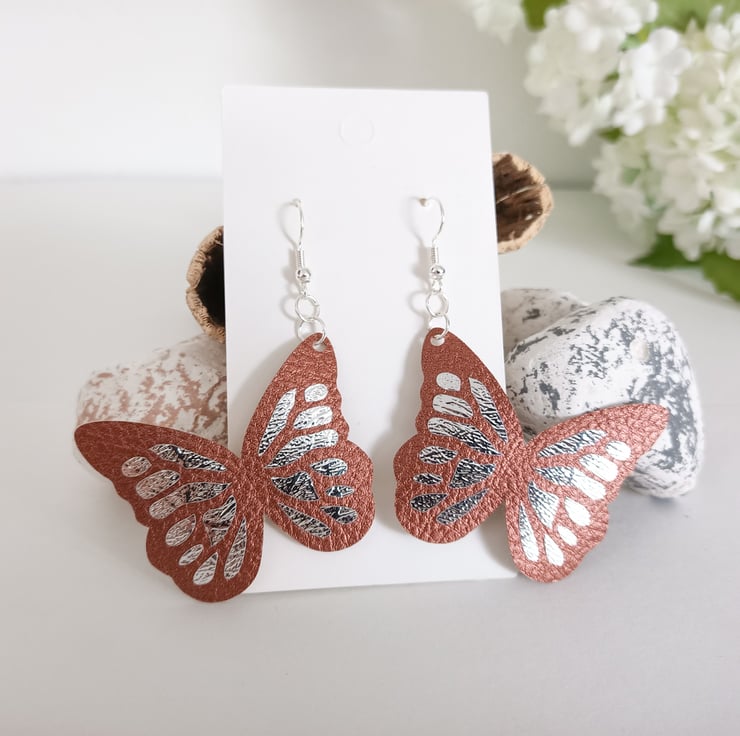 Celebrate autumn with these copper coloured faux leather butterfly earrings. The earrings feature a silver butterfly design on the faux leather. The earrings hang from silver plated fish hooks.
