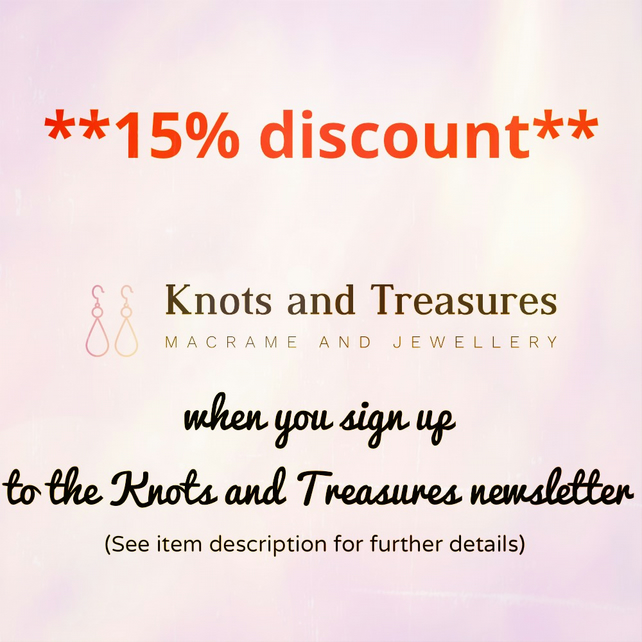 I offer 15% discount on your first order for signing up to the shop newsletter. Please sign up at https://mailchi.mp/c338db471419/knotsandtreasures-newsletter.