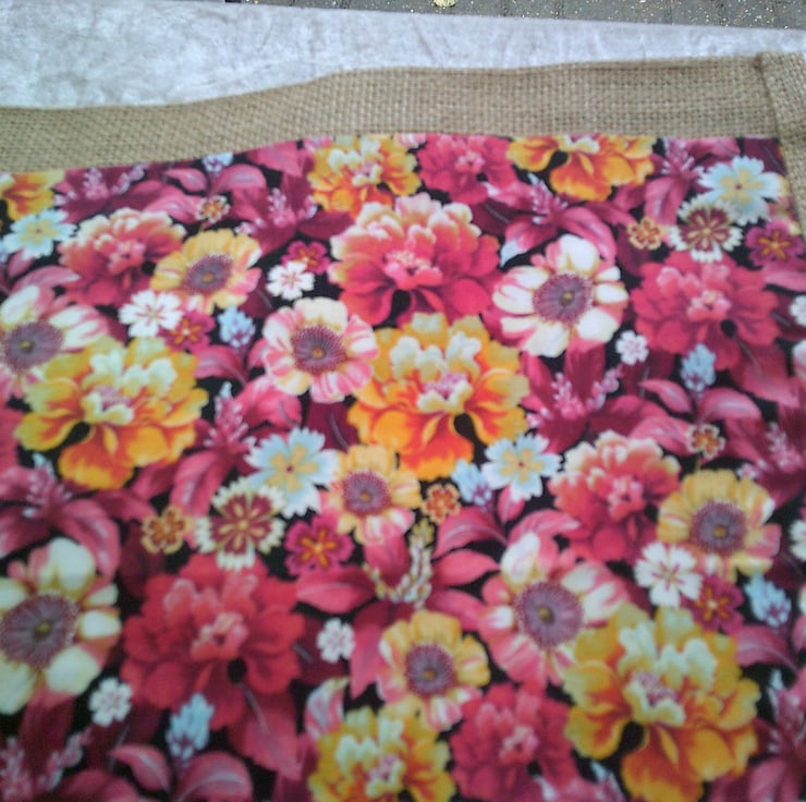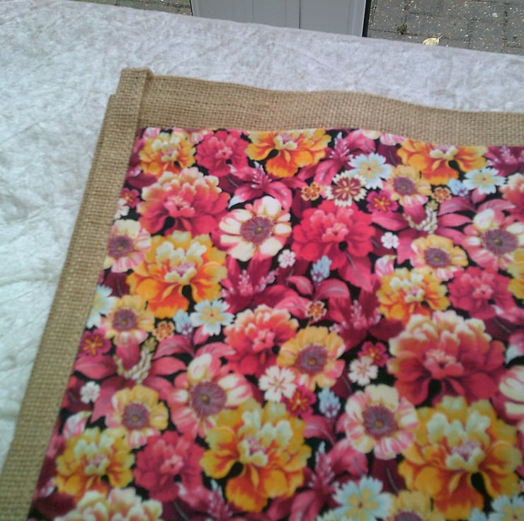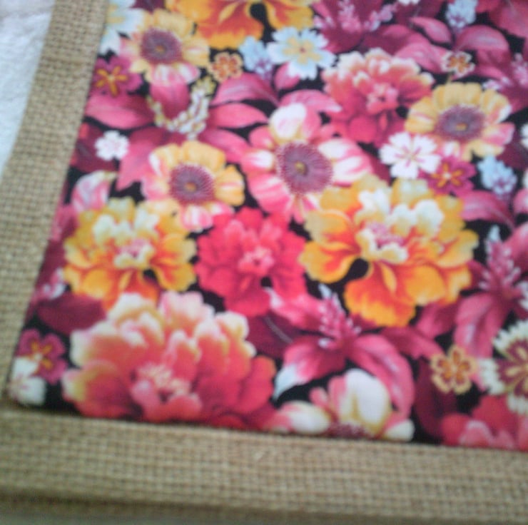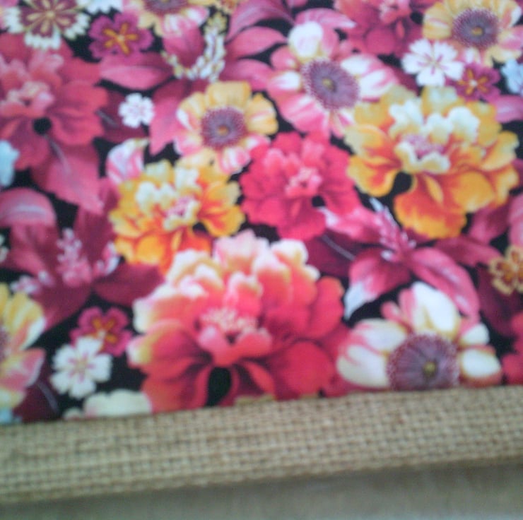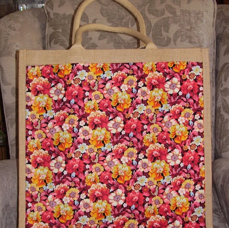 Natural Jute bag with a fabric panel that forms a handy pocket for all those small items that disappear to the bottom of your bag when you are out shopping - phone, keys and purse. The panel is hand sewn onto the bag and features an array of brightly coloured flowers. The bag measures approximately 40 cm x 40 cm x 15cm (16 inches x 16 inches x 6 inches).