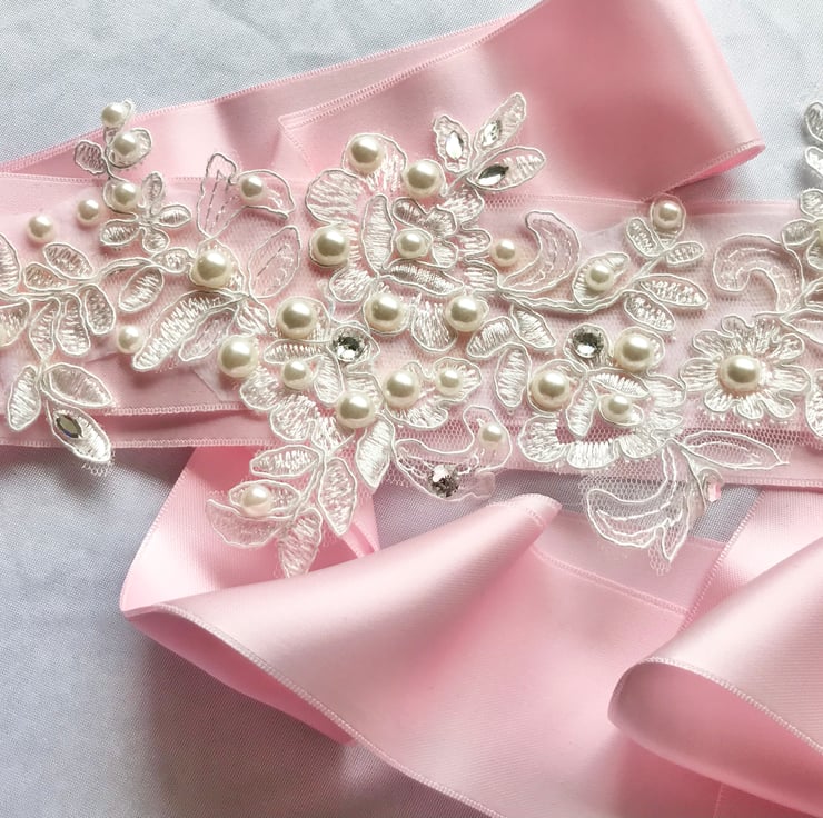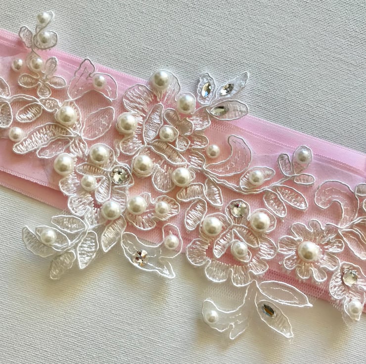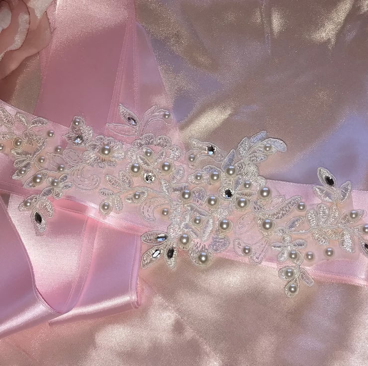 Pretty in pink satin bridal sash belt to decorate a lovely gown . Embellished with Swarovski crystals and faux pearls.