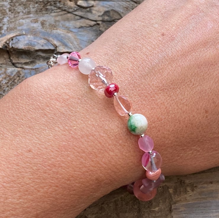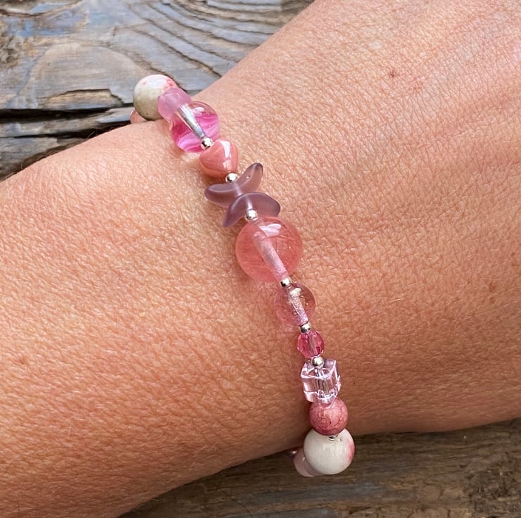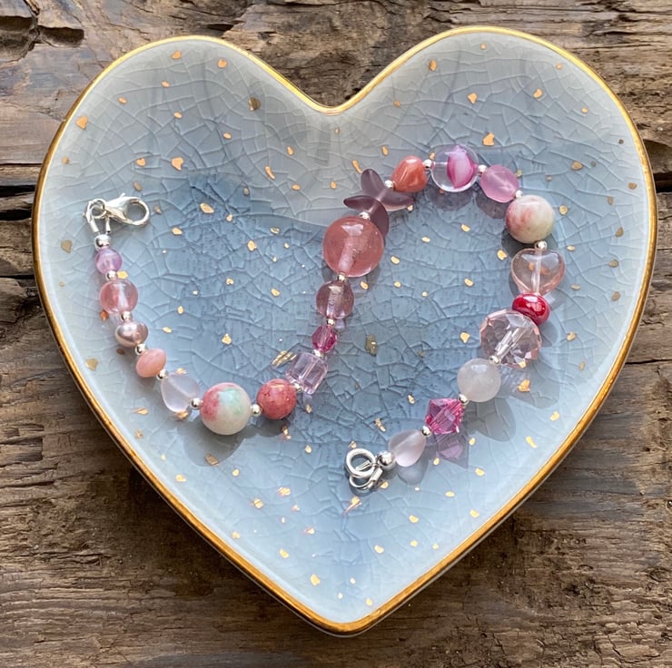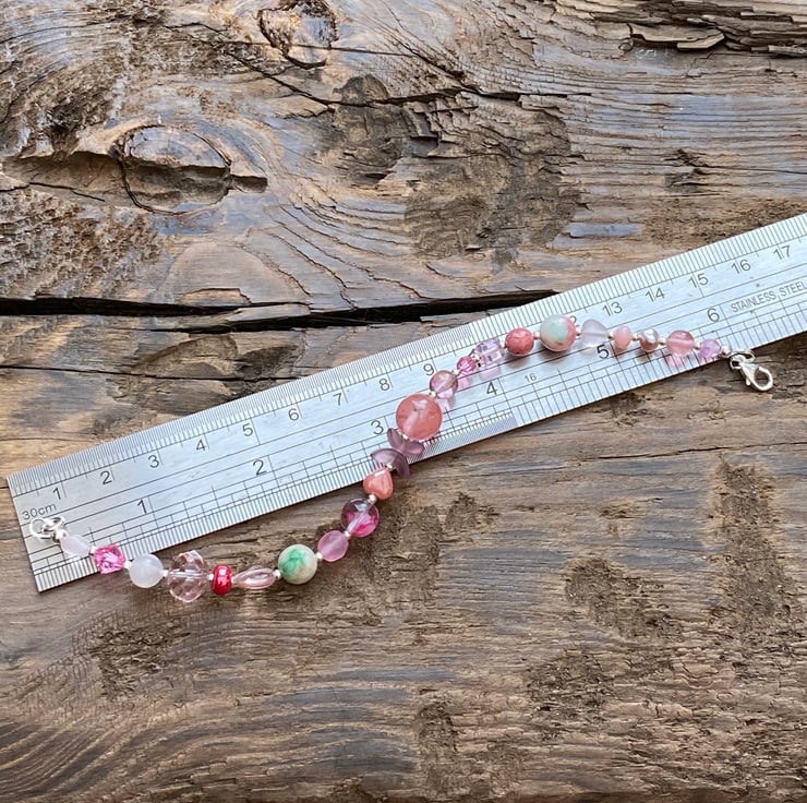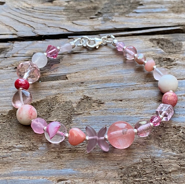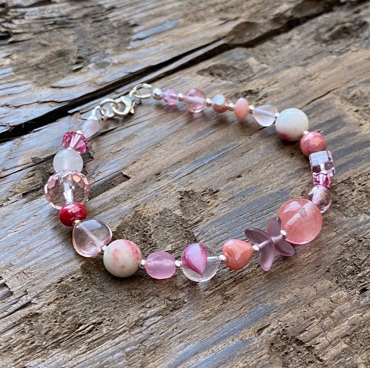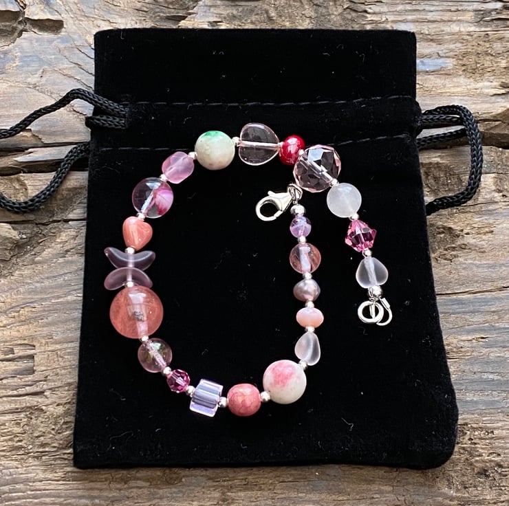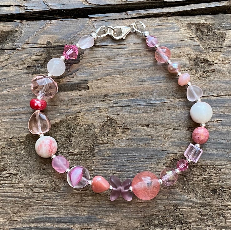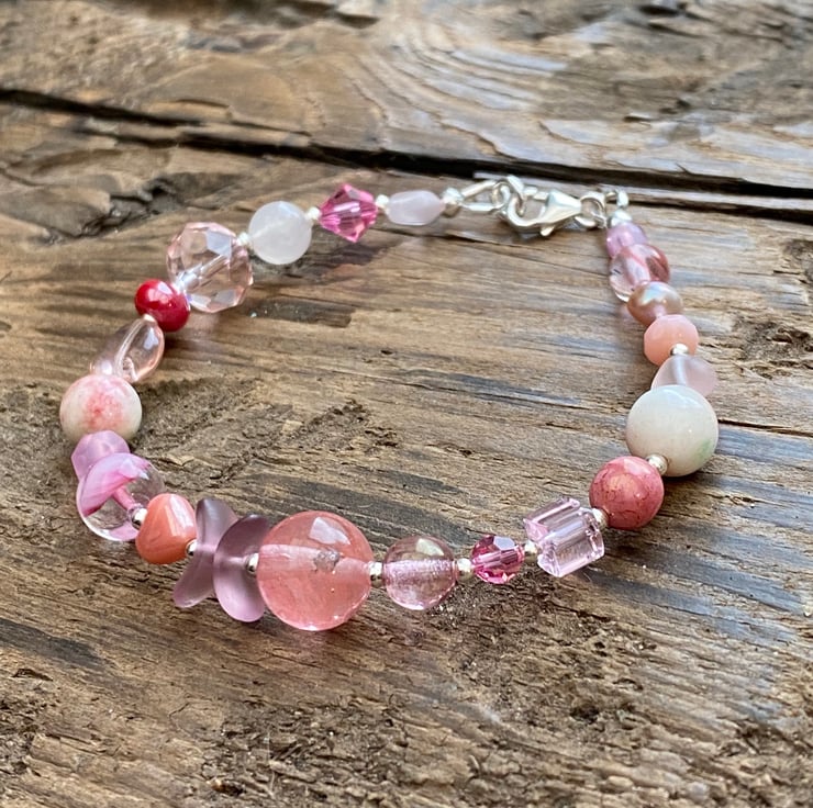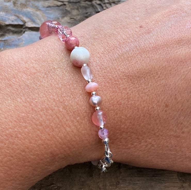 This unique bracelet has been made using a selection of semi precious beads, pearls, Czech glass and sterling silver beads. Hand strung onto strong tiger tail jewellery wire and fastened with a lobster clasp.