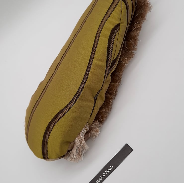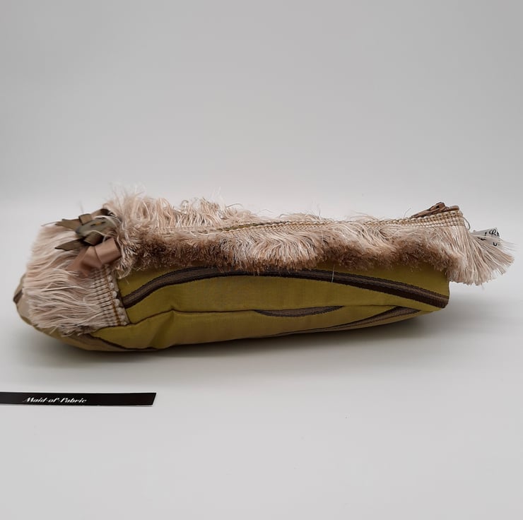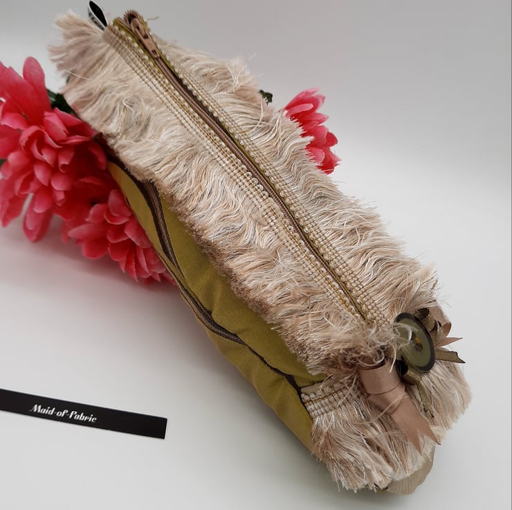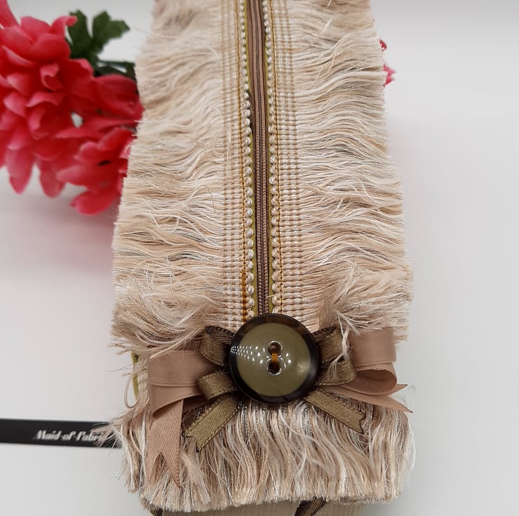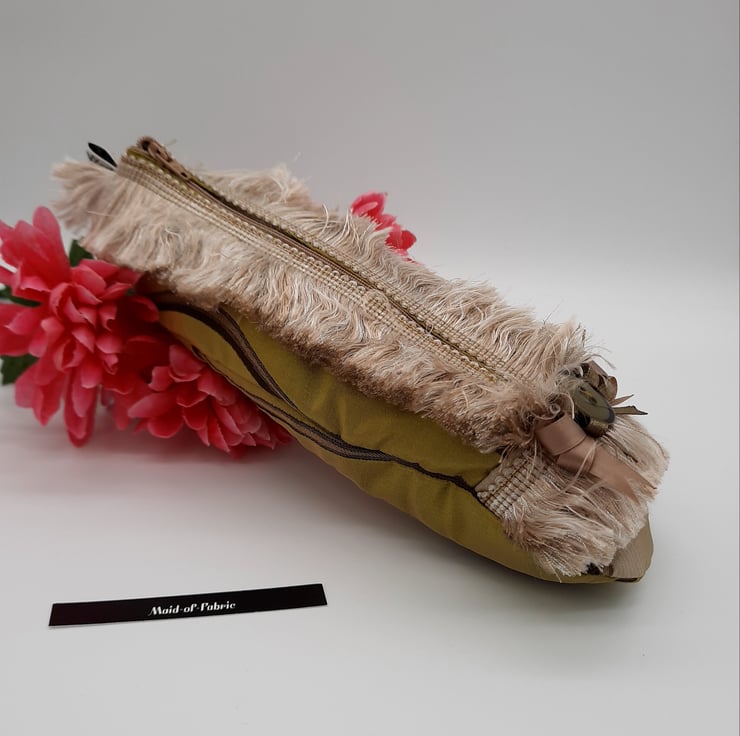 Pencil case shoe made using a olive green wave fabric, beige fluffy trimming, beige and green ribbon and a green button.