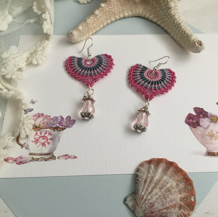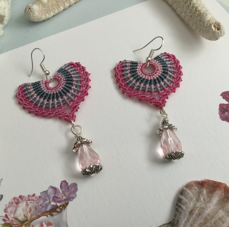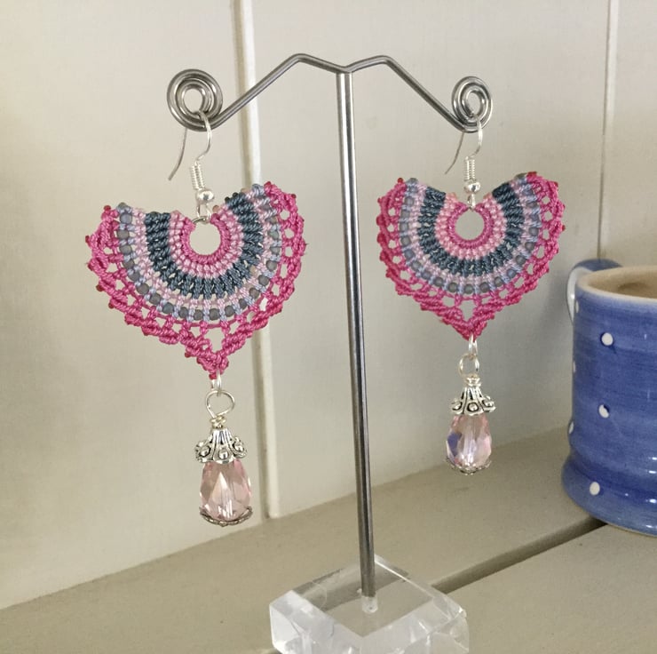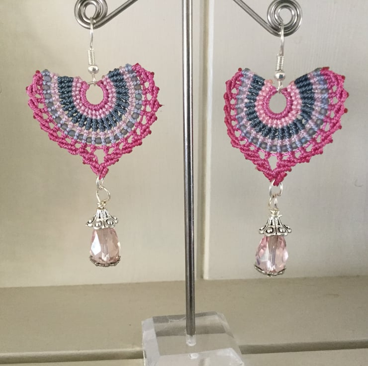 I have created these earrings using the delicate art of macrame using very strong C Lon thread in shades of pink grey and blue, giving a fan effect. Also incorporated in the design I have threaded tiny glass seed beads and finished the design with a pretty pink crystal glass beads.