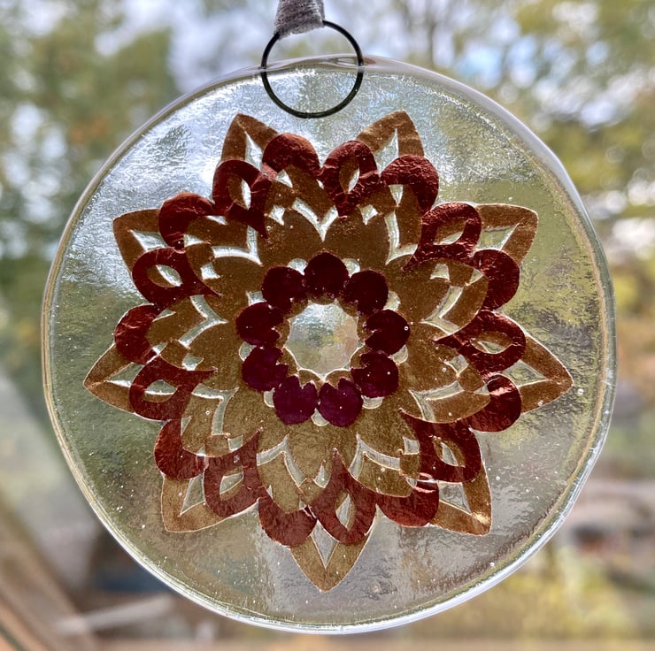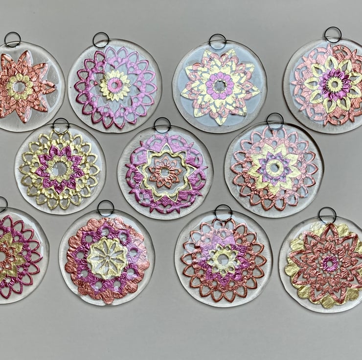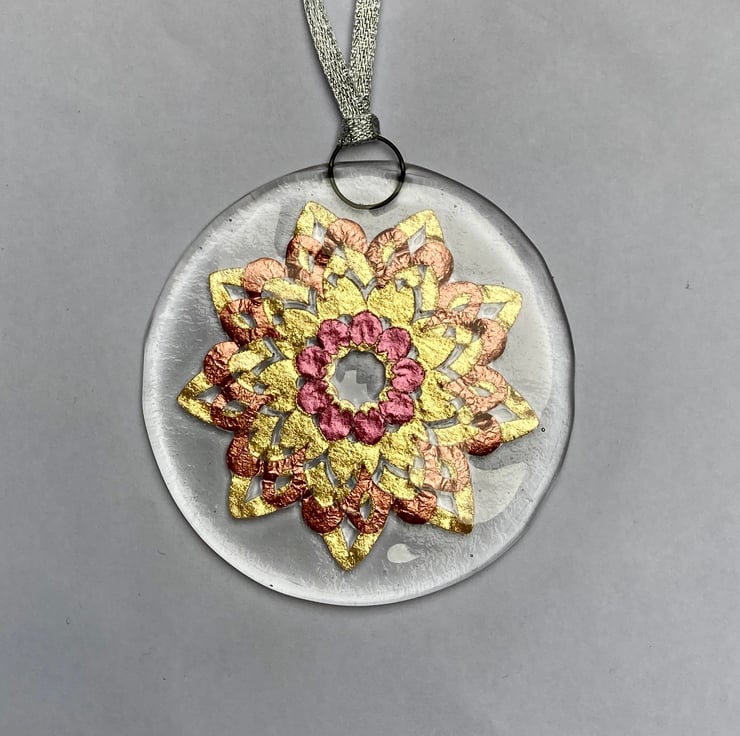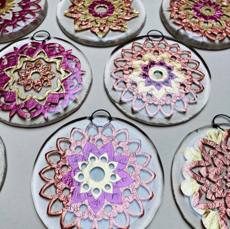 These circular fused glass mandalas are handmade from bullseye glass. Each decoration contains a range of intricate pattern made from metallic mica in gold, pink and copper. They have a small metal ring from which to hang and look lovely on a Christmas tree or hanging in a window.