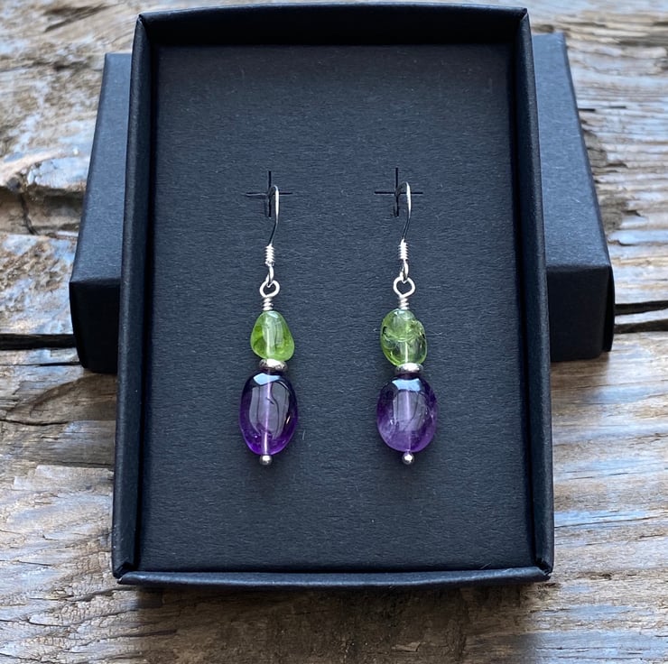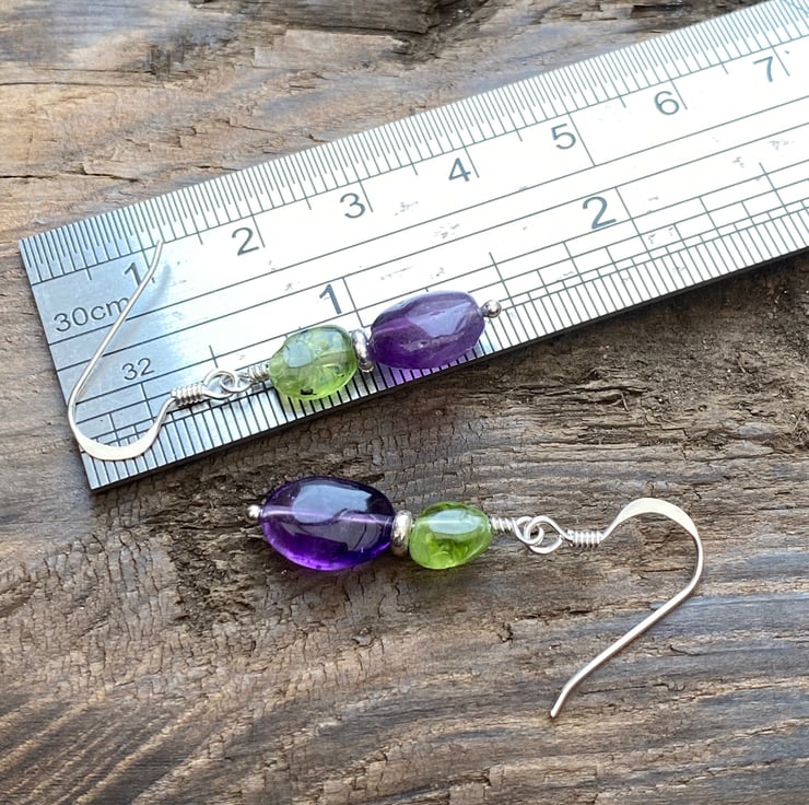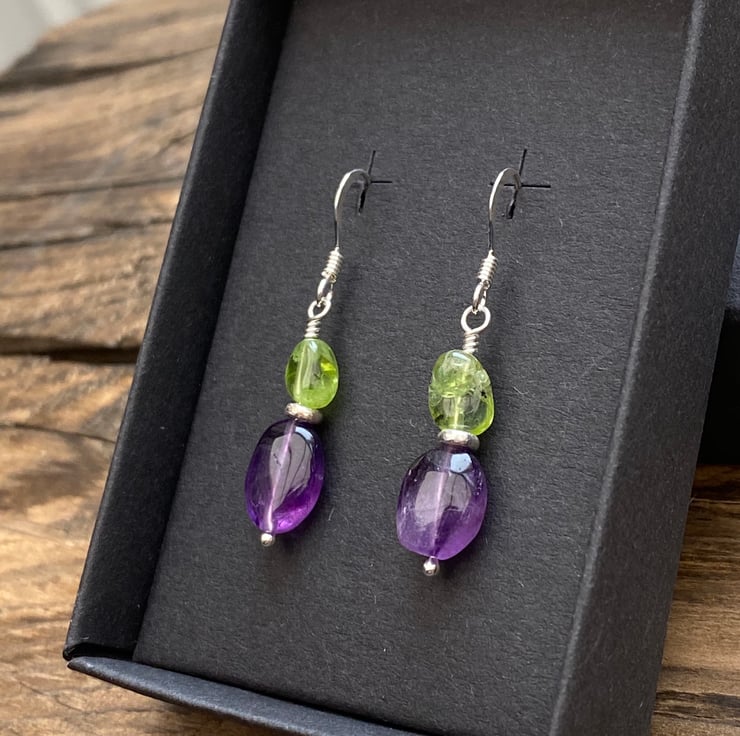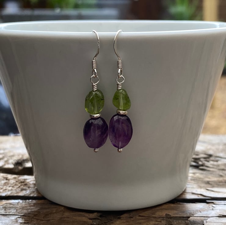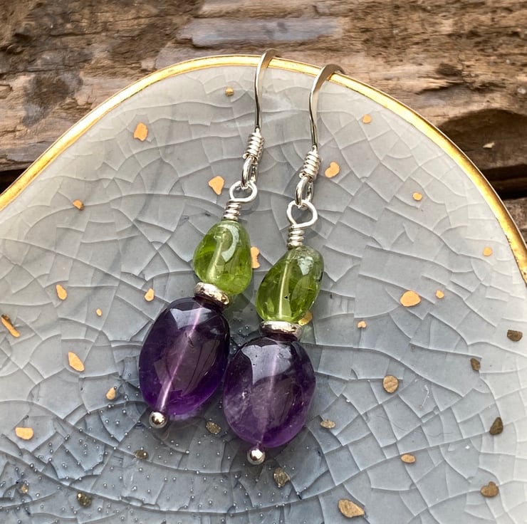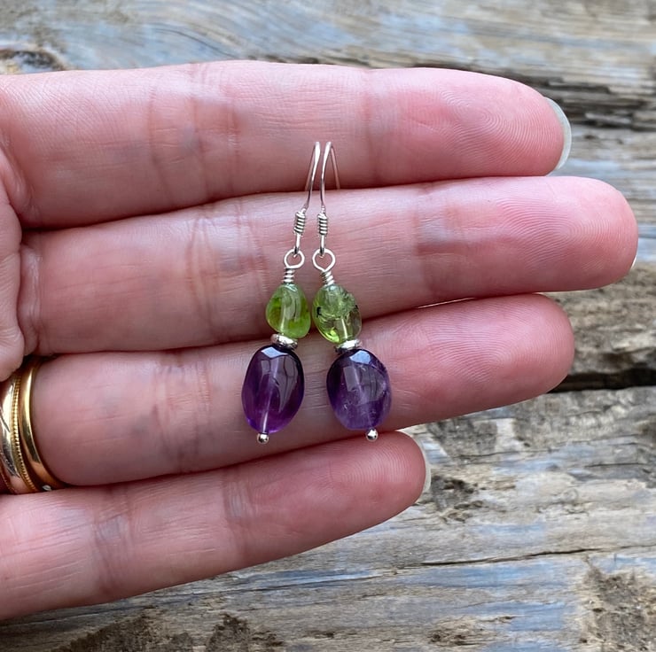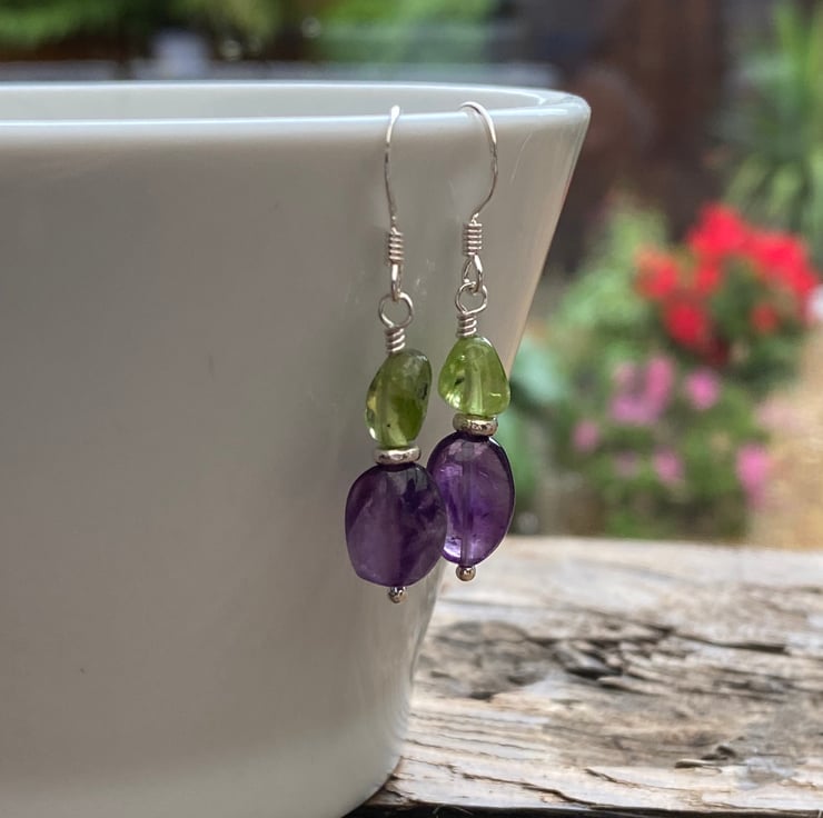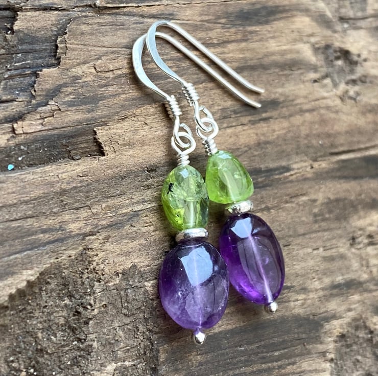 Stunning nuggets of Amethyst and Peridot have been hand wired onto a sterling silver headpin and separated with a Sterling silver spacer bead, hung upon sterling silver earring wires.