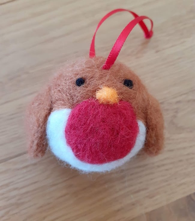 A handmade needle felted robin bauble. A cute robin design complete with sewn on ribbon hanging. Approx. diameter 4.5 cm. Body and wings of robin in brown with a red and white breast, yellow beak and black eyes.