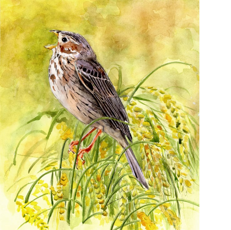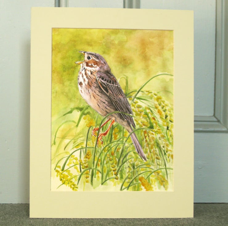 Watercolour painting of a corn bunting 20.7 x 27.3 cm window mounted, overall matte size 35.6 x 27.9 cm (14 x 11 in). Will fit a standard size frame.