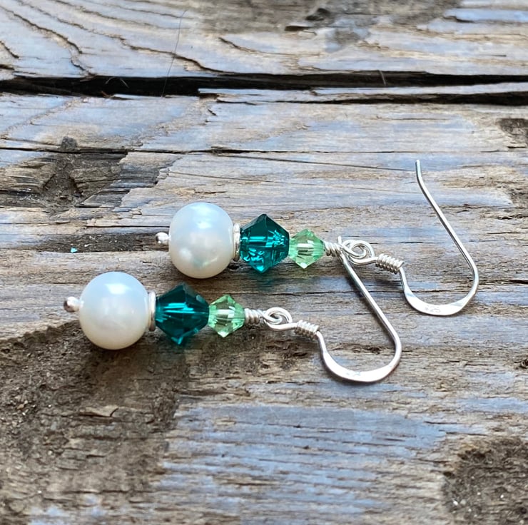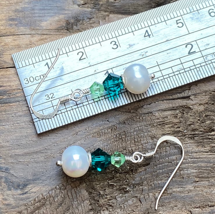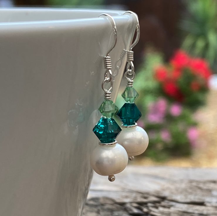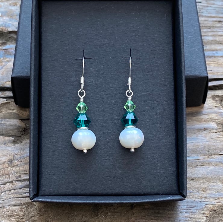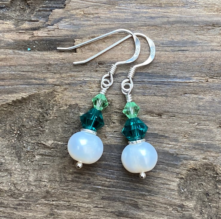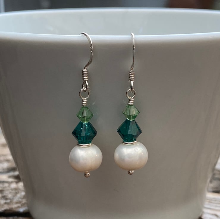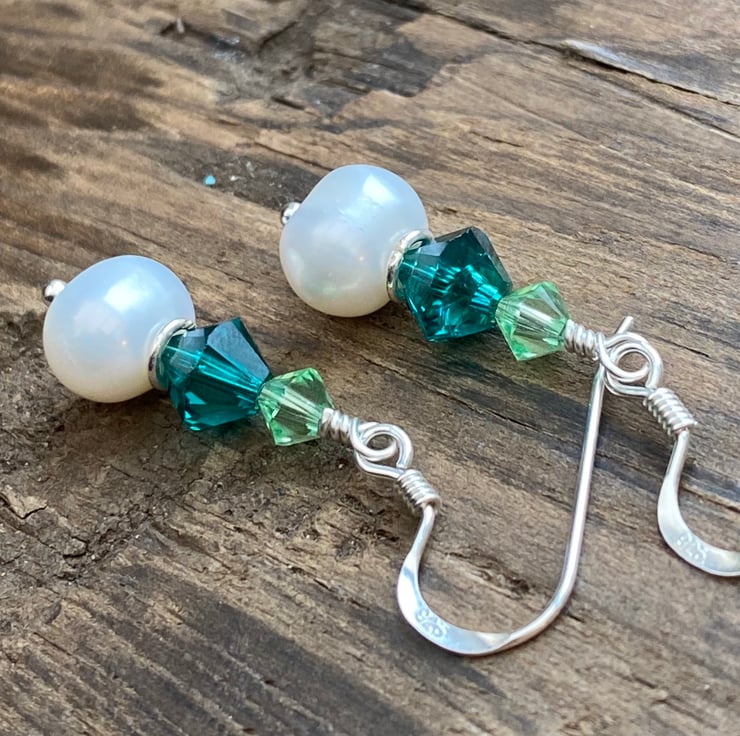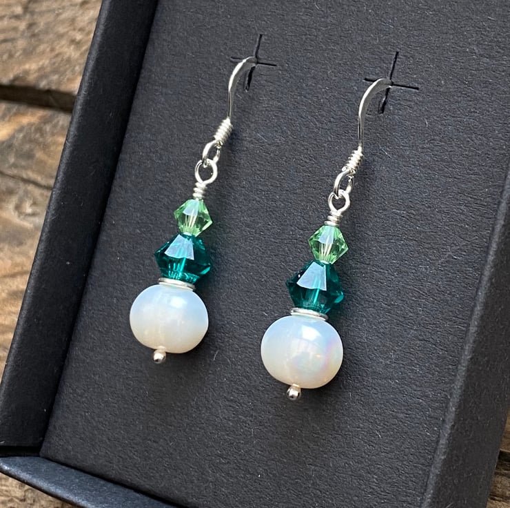 Elegant freshwater pearls have been teamed with emerald and peridot Swarovski crystals separated by a ring of sterling silver. Hand wired onto a sterling silver head pin and hung from sterling silver earrings.