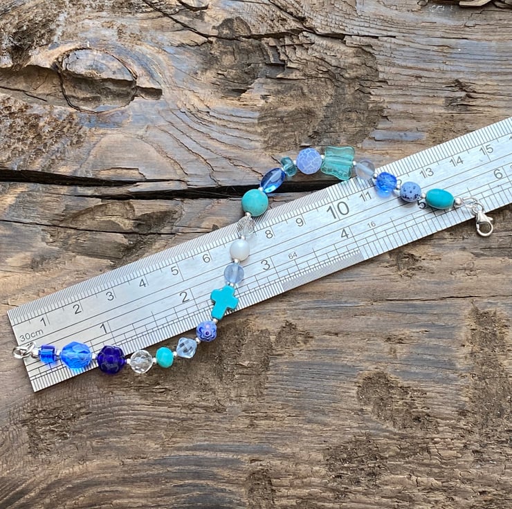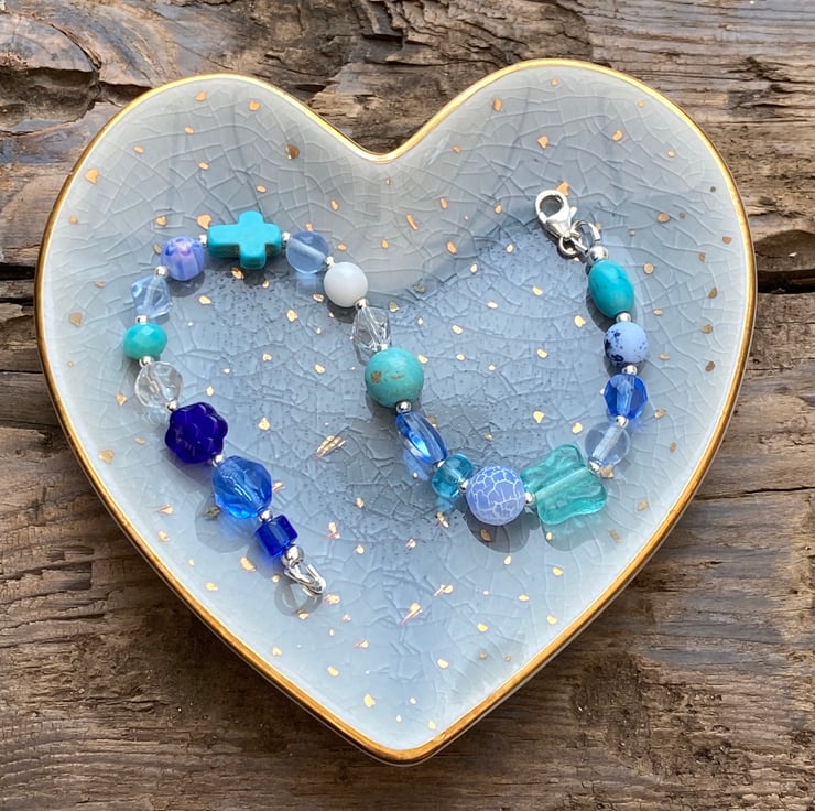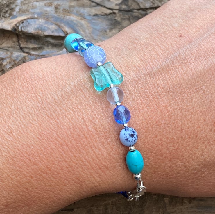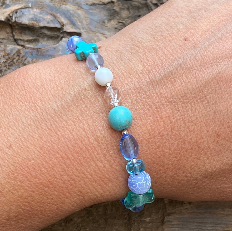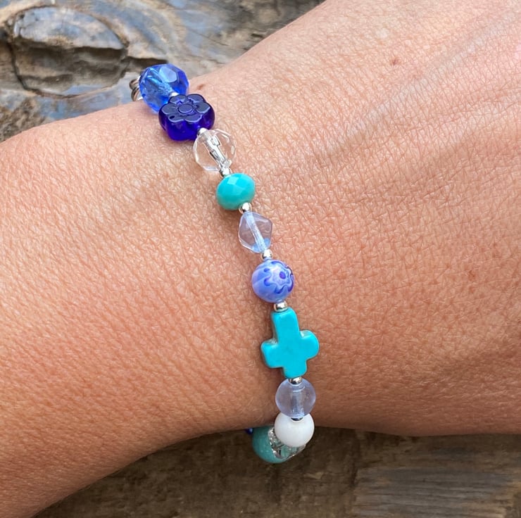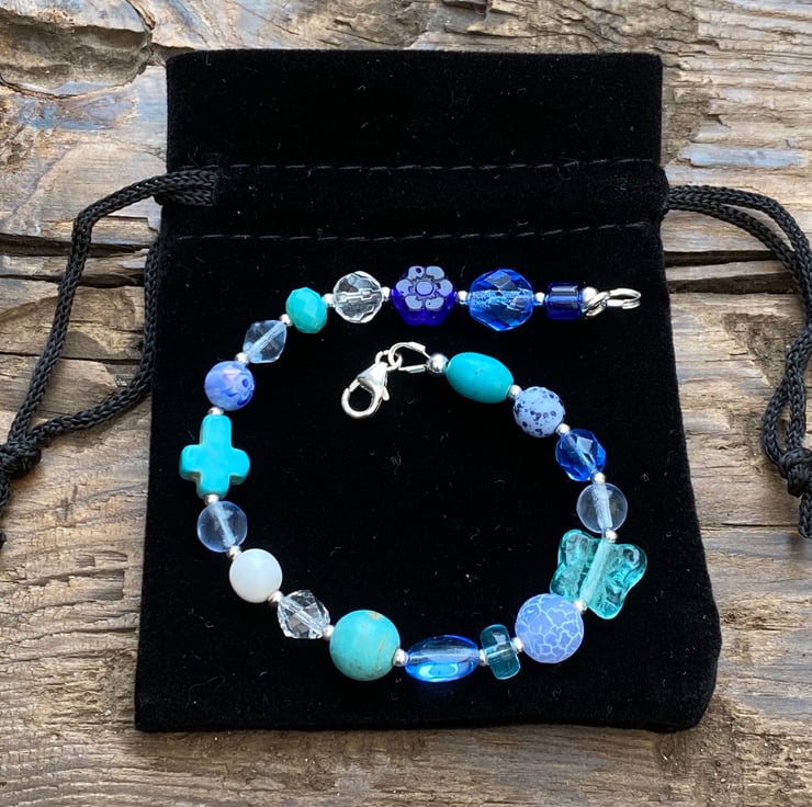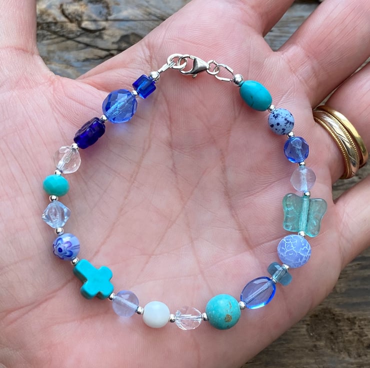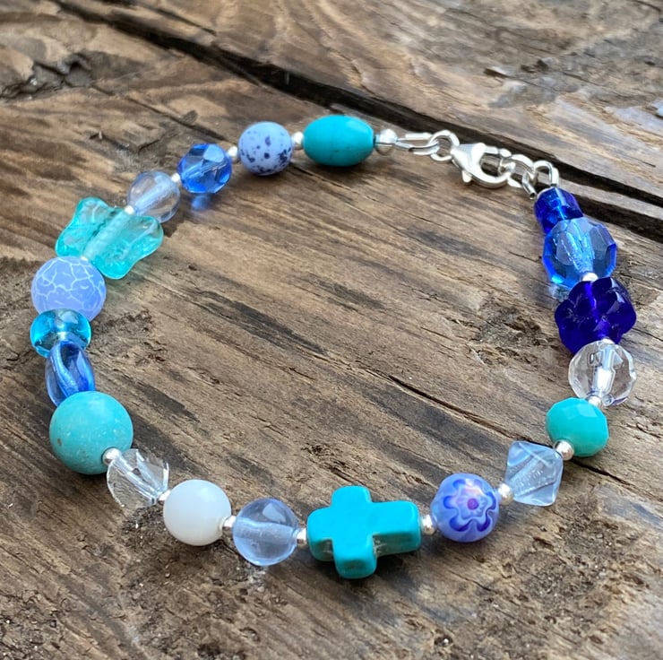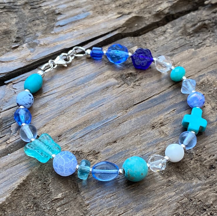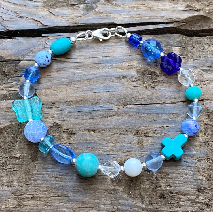 This unique bracelet has been made using a selection of semi precious beads, Swarovski crystals, Czech glass and sterling silver beads. Hand strung onto strong tiger tail jewellery wire and fastened with a lobster clasp.