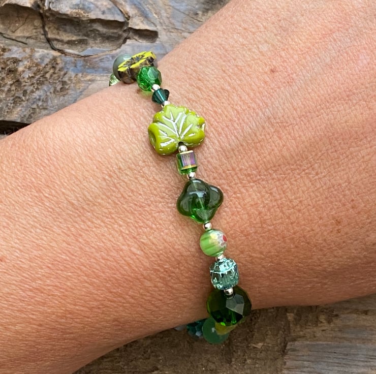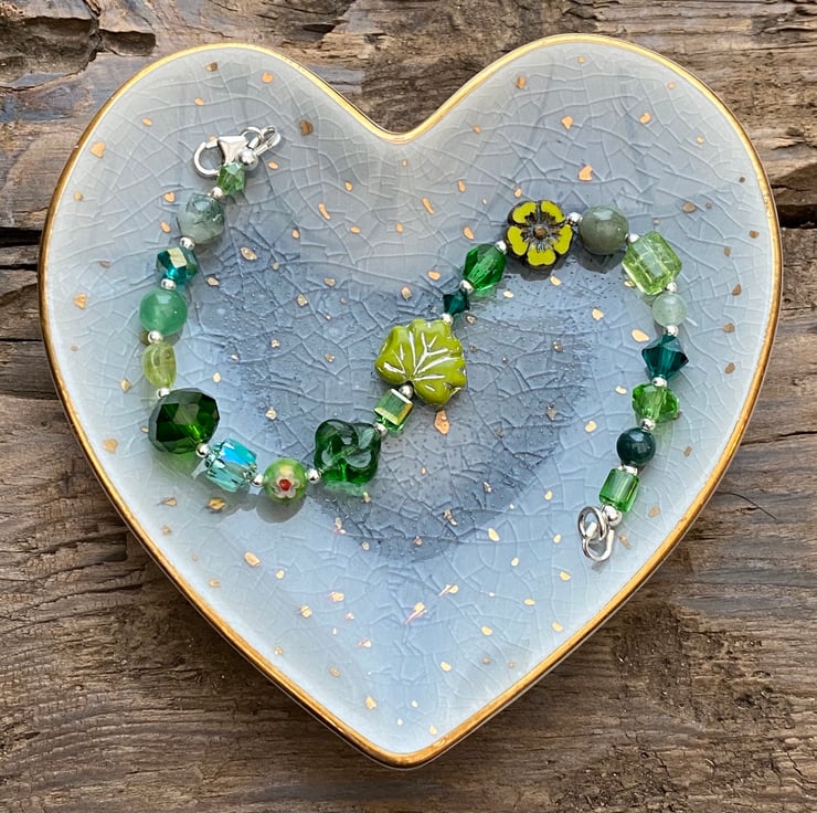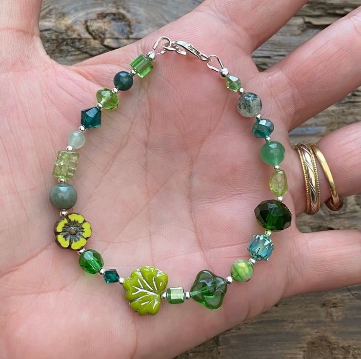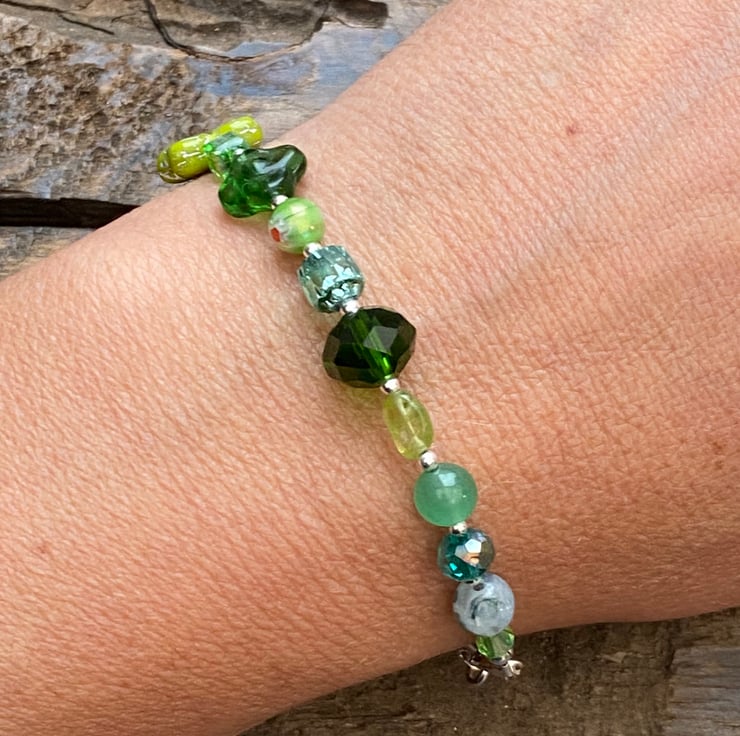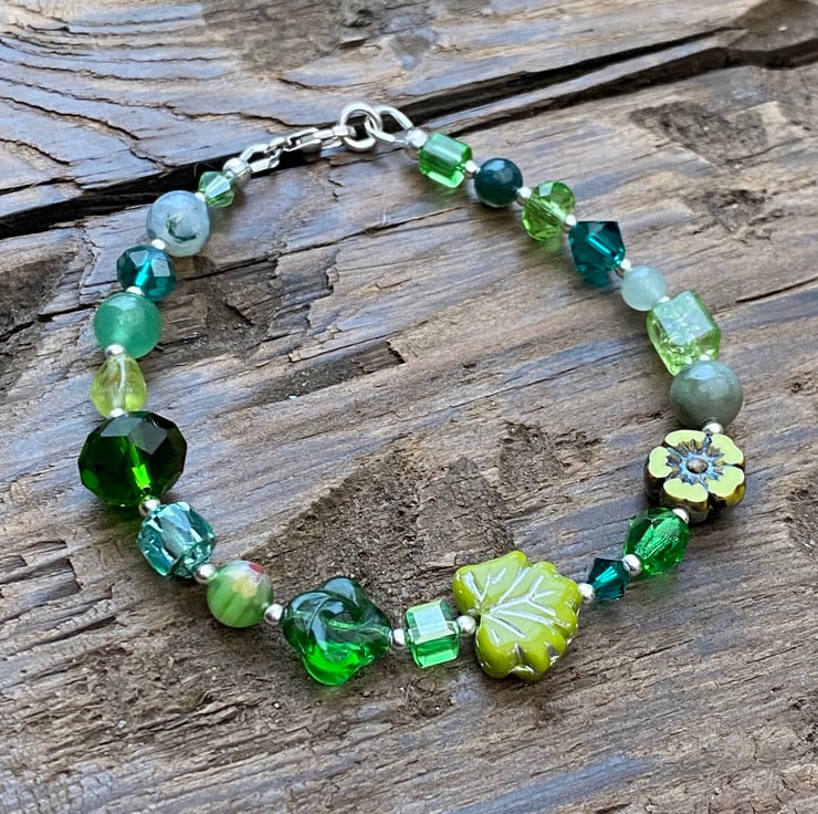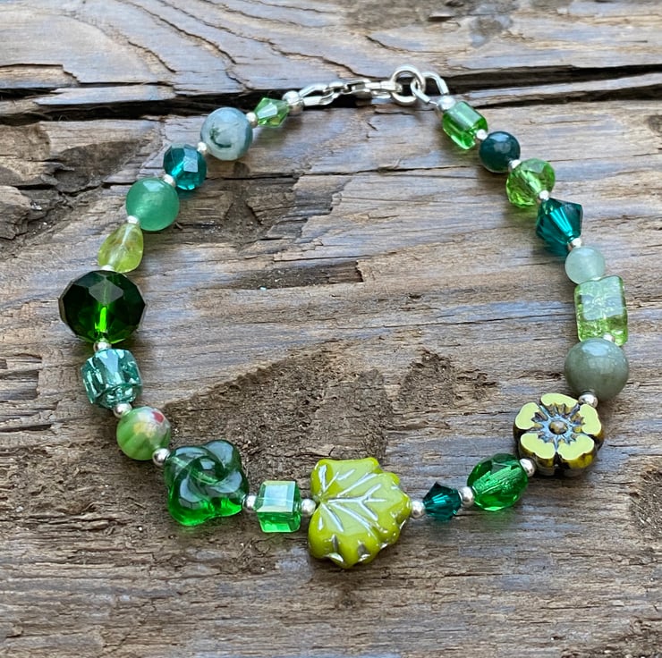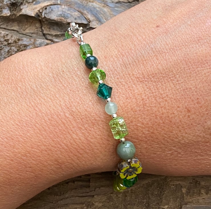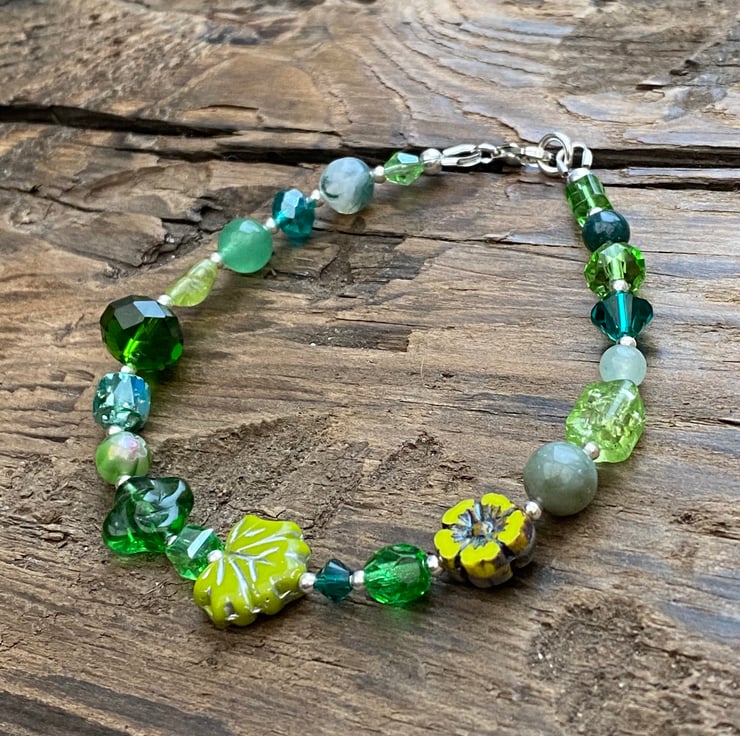 This unique bracelet has been made using a selection of semi precious beads, Swarovski crystals, Czech glass and sterling silver beads. Hand strung onto strong tiger tail jewellery wire and fastened with a lobster clasp.