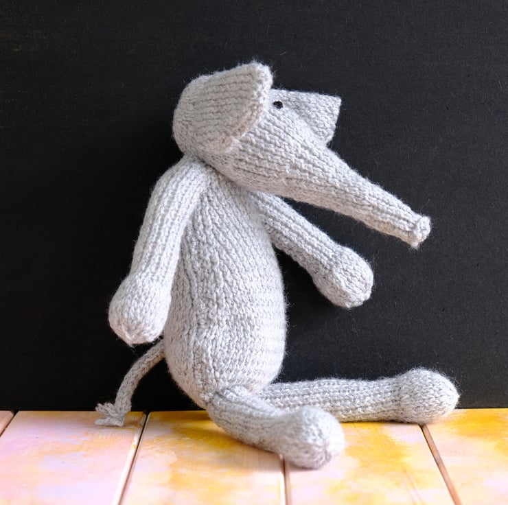 The Elephant is 35 cm long and 16 cm wide with front legs by its side. The tail is 7cm long. It is knitted in grey double knitting. The eyes are hand embroidered in black embroidery cotton.