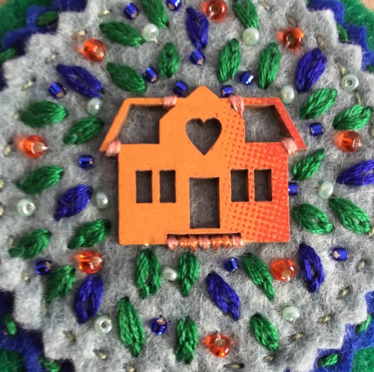 I love hand embroidery and making small textile pictures for greeting cards. The little house in the centre of this picture with its heart, sends wishes for happiness in a new home.