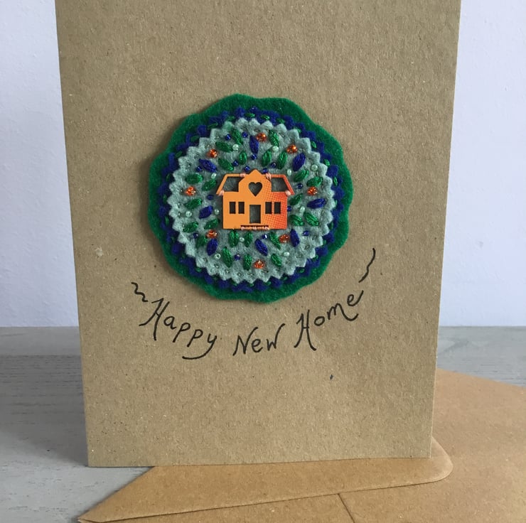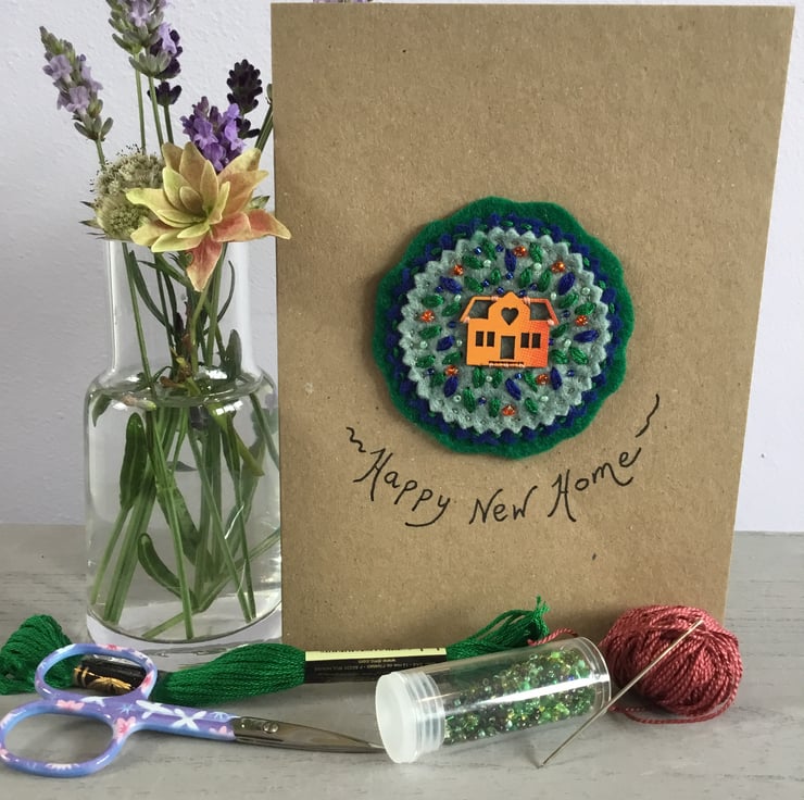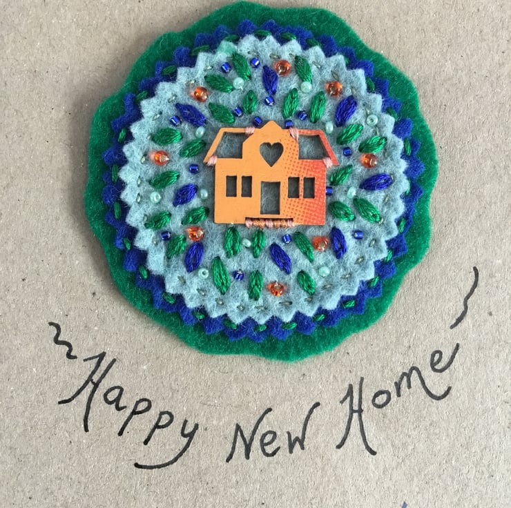 The little wooden house in the centre of this card is hand stitched onto a background of green and blue felt. The house with its heart motif is surrounded by blue, green and orange embroidery stitches and beads. The hand written message ‘Happy New Home’ can be continued inside, as the card is blank.