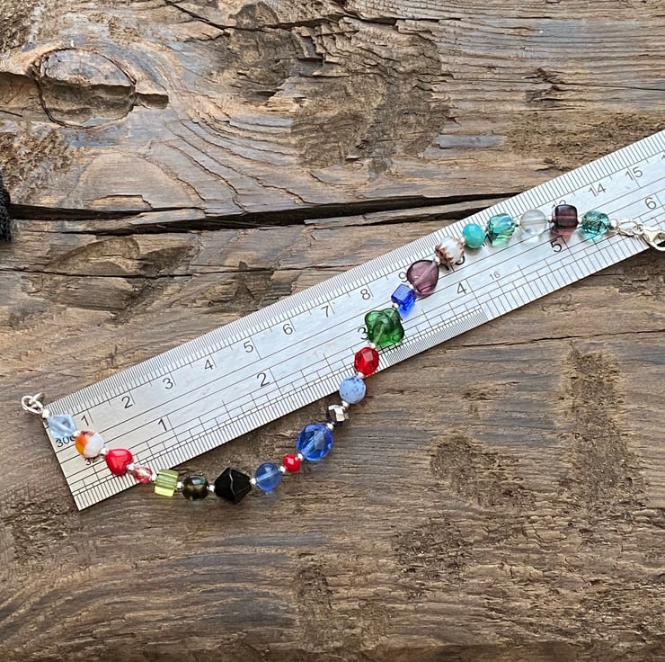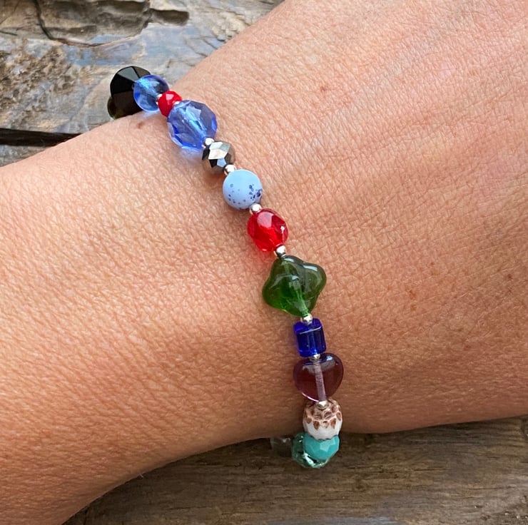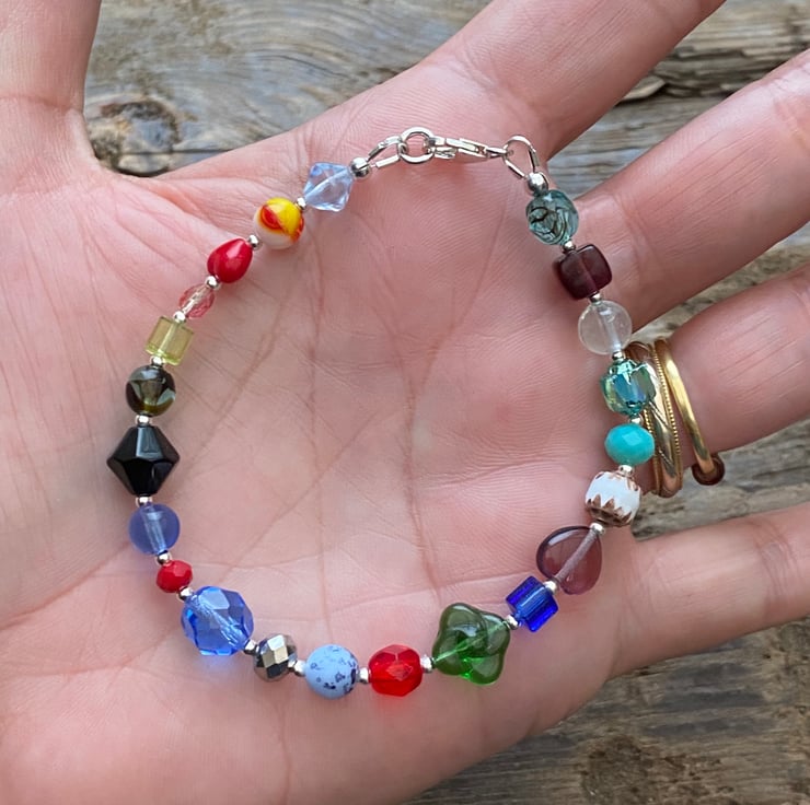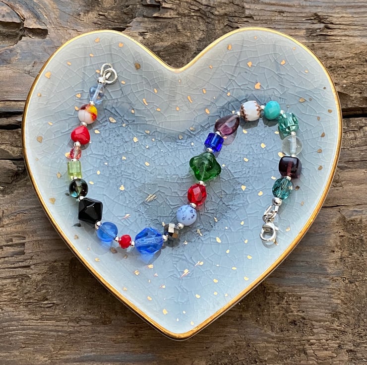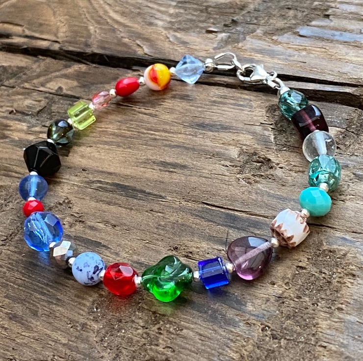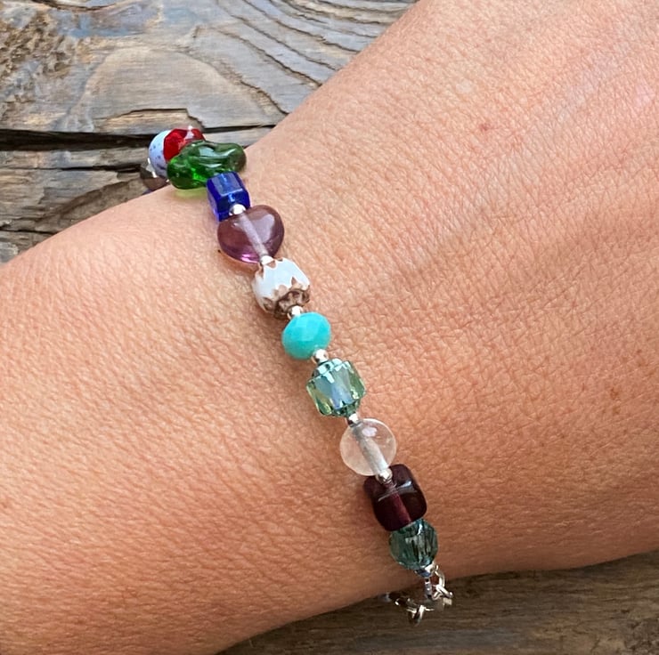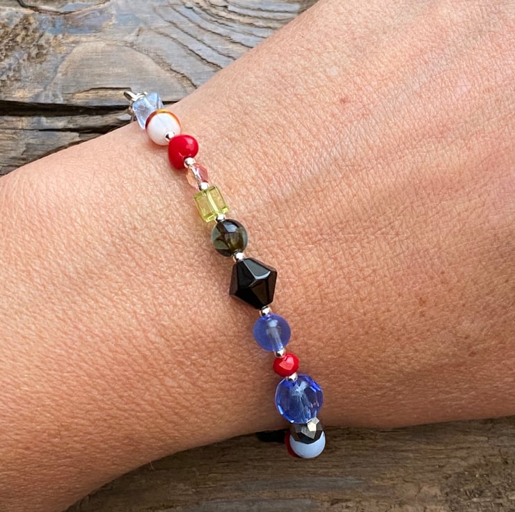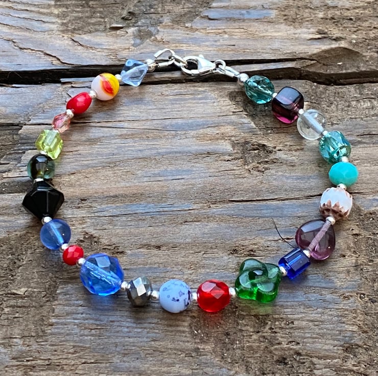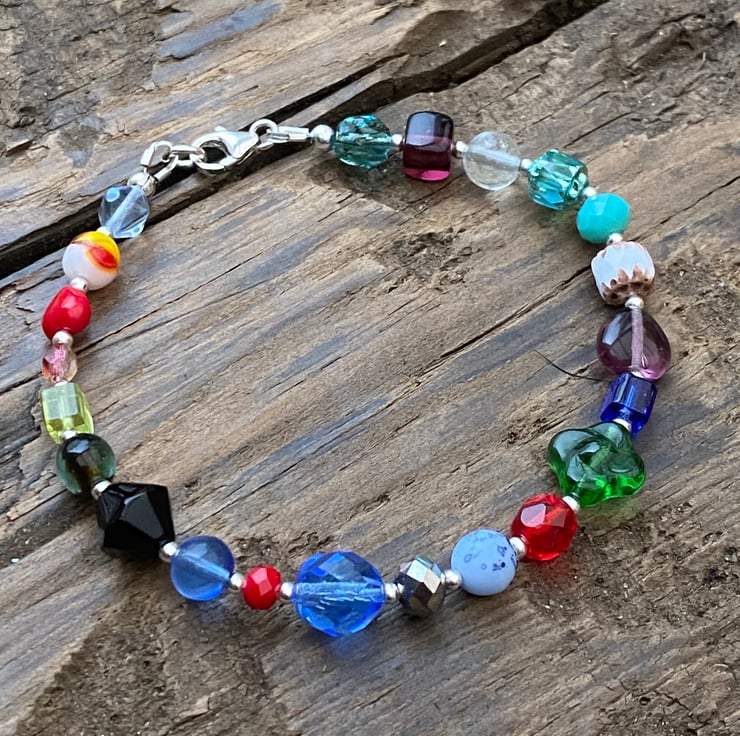 This unique bracelet has been made using a selection of crystals, Czech glass and sterling silver beads. Hand strung onto strong tiger tail jewellery wire and fastened with a lobster clasp.