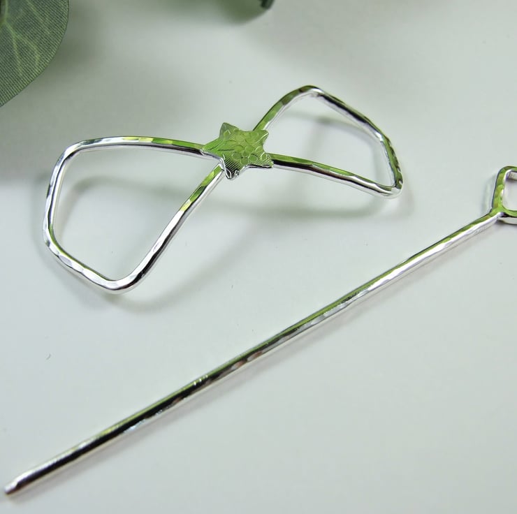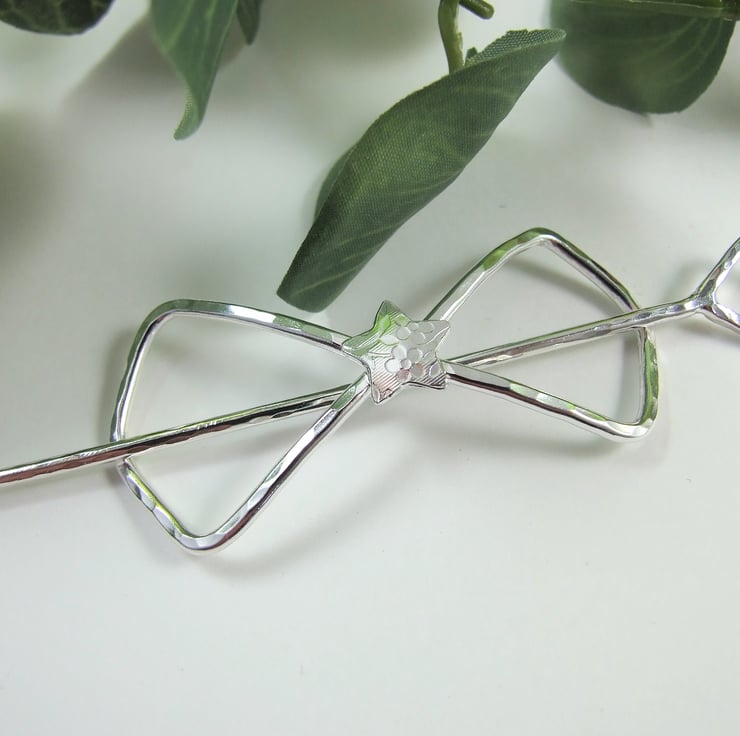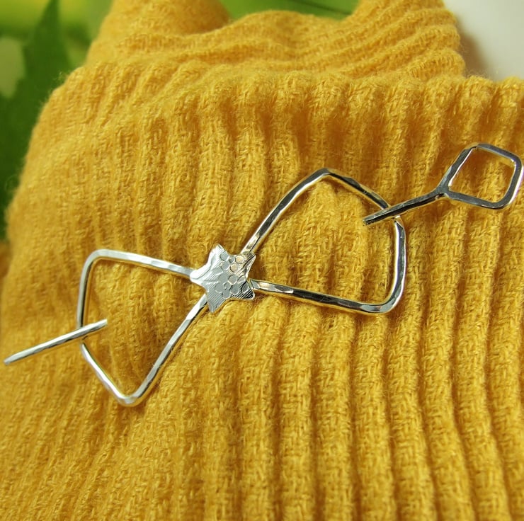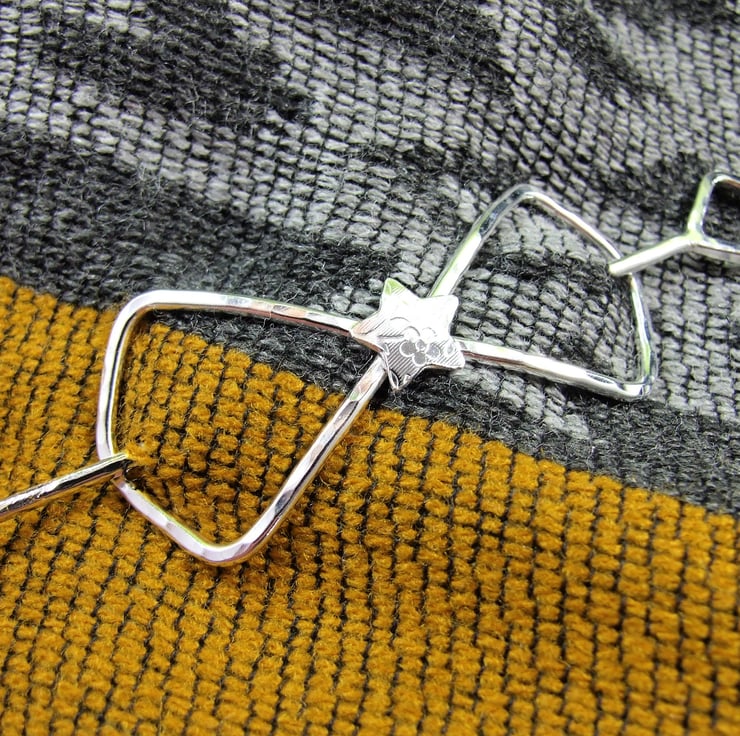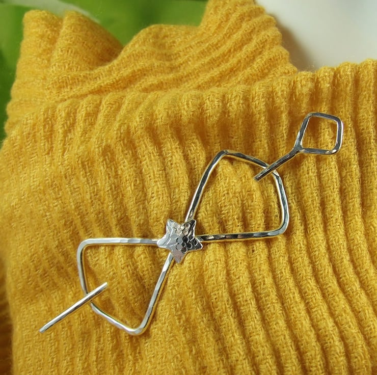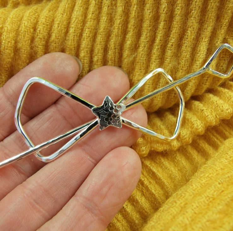 I created this shawl pin from sterling silver 1.9mm wire, cut and formed into a bow shape with a atterned star for the centre. Bow measyres measuring approx 2.5 inches across and hammered finish and separate pin with a diamond shape at one end and a blunt point at the other. The pin measures approx 3.5 inches