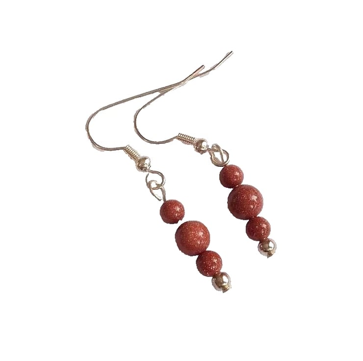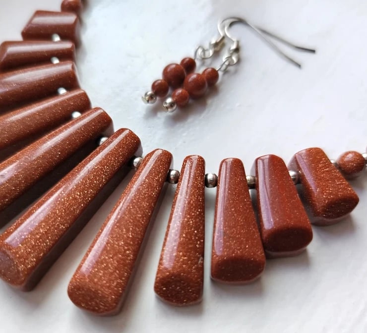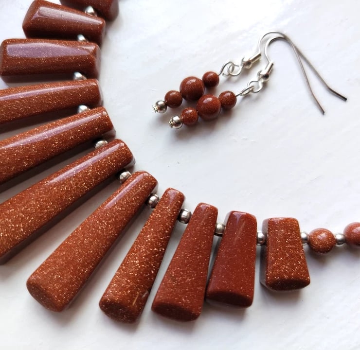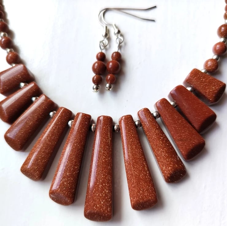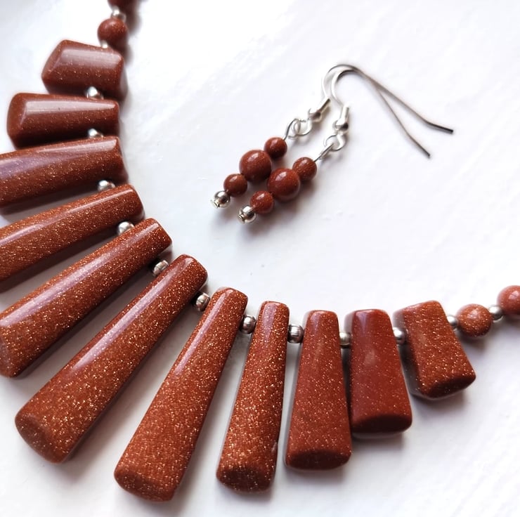 Genuine Rich Brown Glittery Goldstone Gemstone Chunky Tapered Necklace & Earrings Gift Set