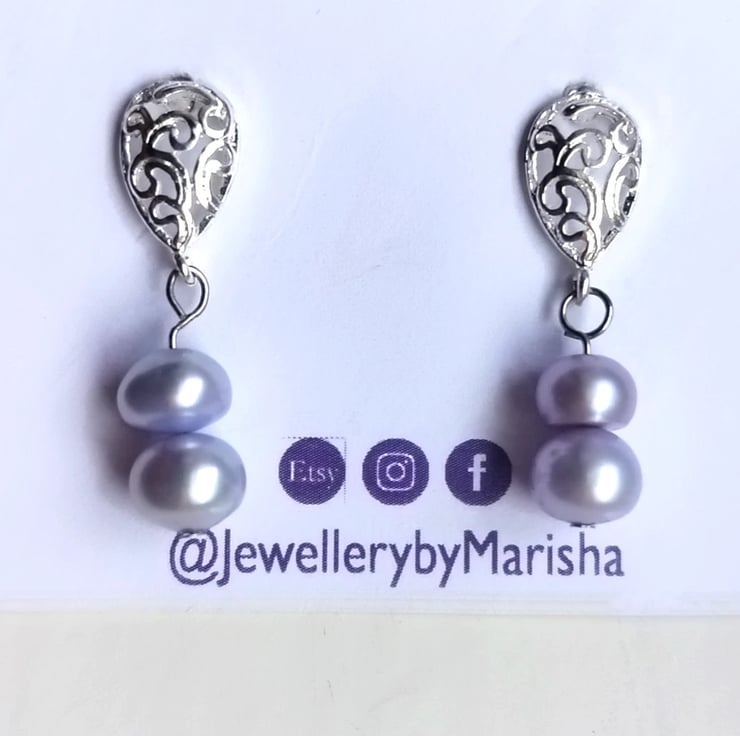 Handmade Cornflower Lilac Freshwater Pearl Filigree Stud Earrings Silver Plated