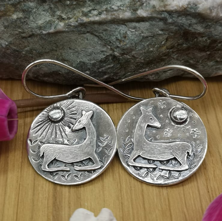 Made using traditional jewellery making techniques. Using my jewellers saw, hand engraving and hammer texturing, these deer drop earrings are oxidised and measure approx 19mm across each disc. Finished with little sky blue topaz cabachons.