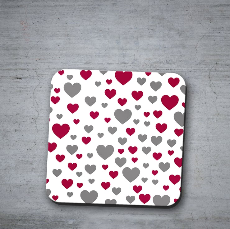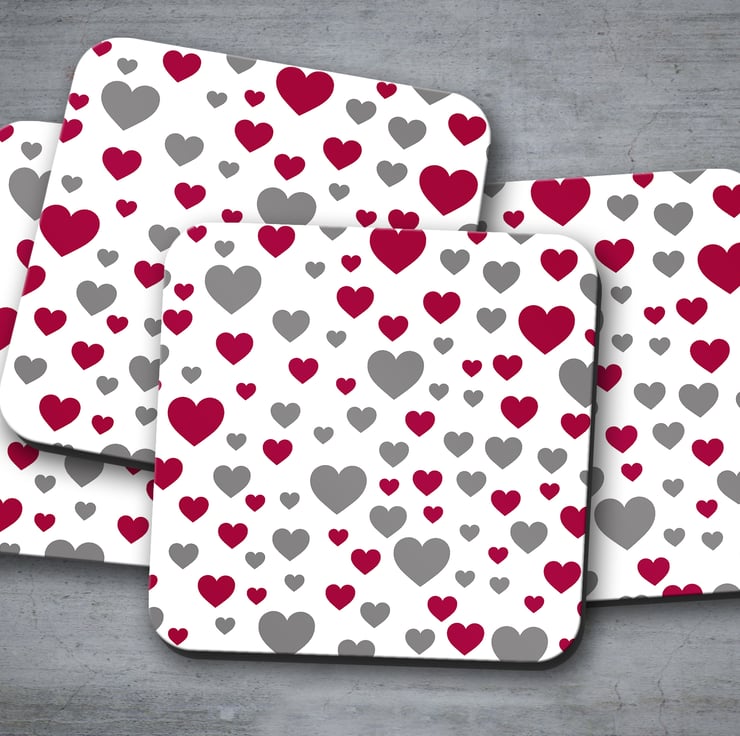 This attractive white with red and grey hearts design coaster collection is available as a set of 4