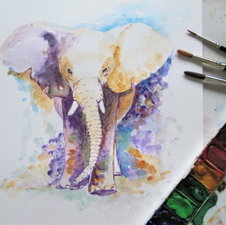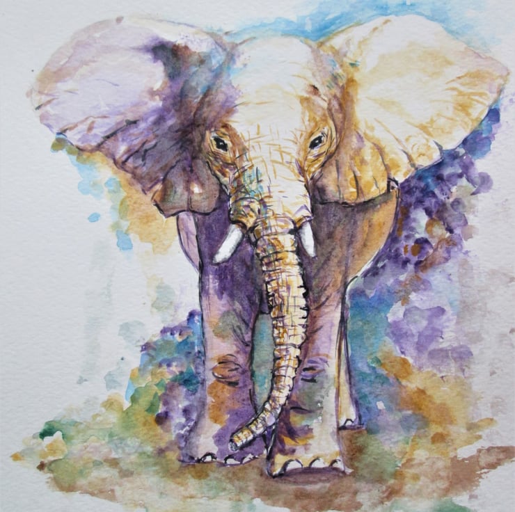This watercolour depicts the majestic elephant. A loosely painted watercolour on paper. Colourful elephant.