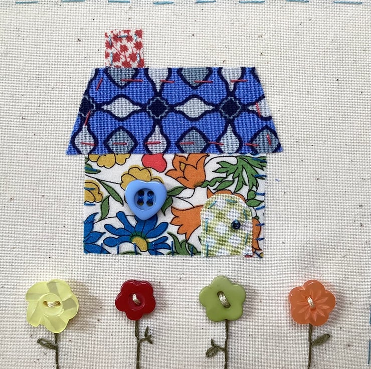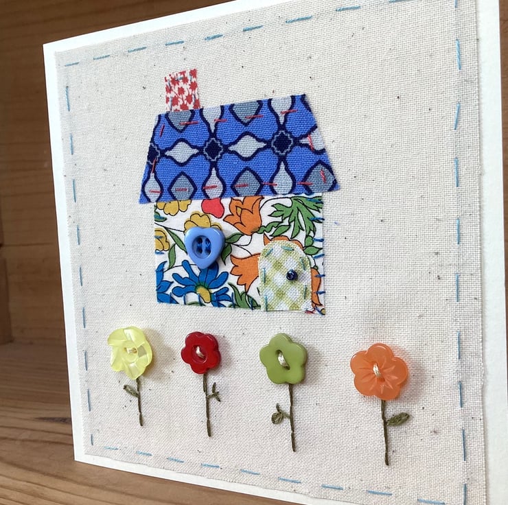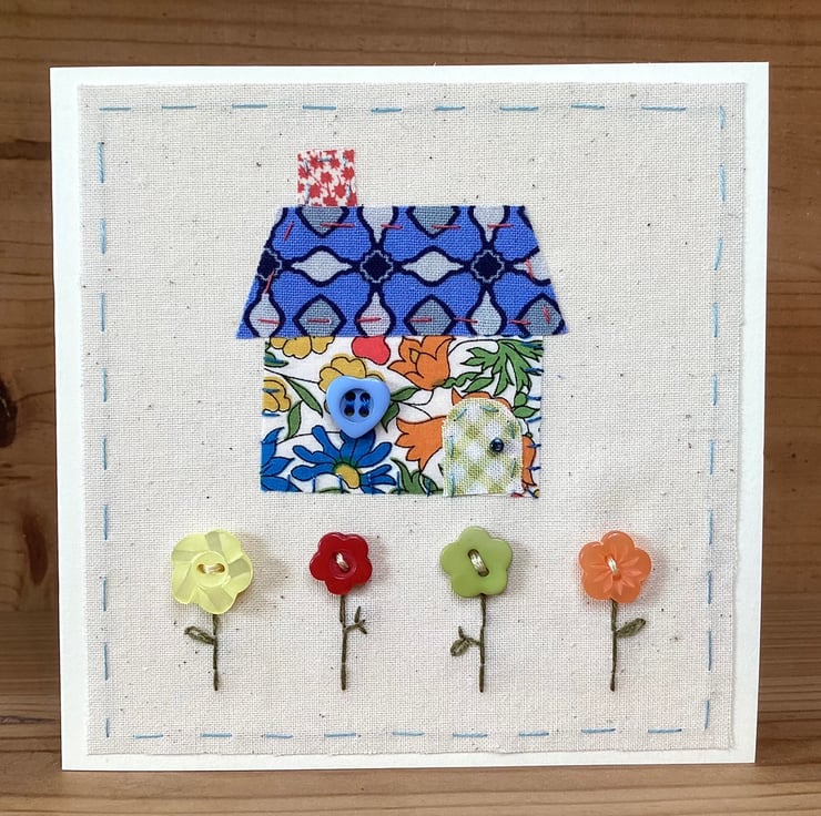 A beautifully made hand stitched textile card featuring a little cottage with a garden of button flowers stitched with bright Liberty patterned fabric. This card is perfect for any occasion and is left blank inside for your own message. This card measures 12.5 x 12.5cm and is stitched onto a calico background and backed on cream card with matching cream envelope. All of my cards are carefully packaged in tissue paper and sent out within one day of purchase unless a custom order.