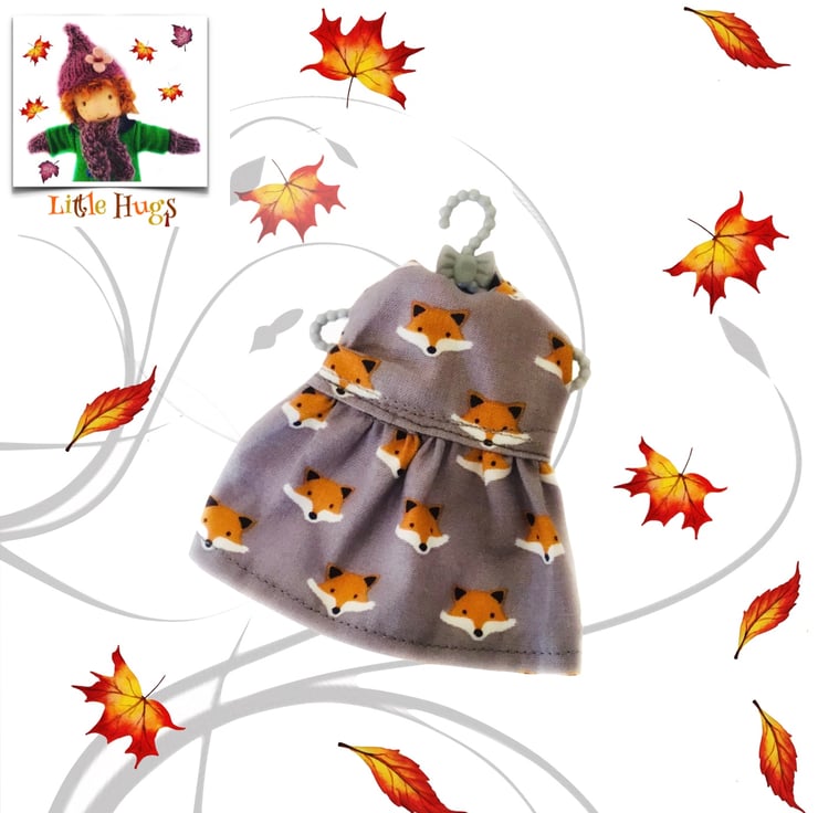 A lovely little fox print dress, made especially to fit the Little Hugs dolls or baby Daisy. The dress is made from cotton and has a lined bodice and gathered skirt. It fastens at the back with a little popper and comes on a cute little hanger.