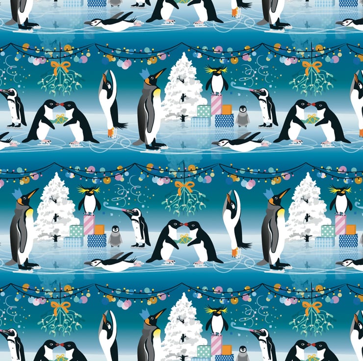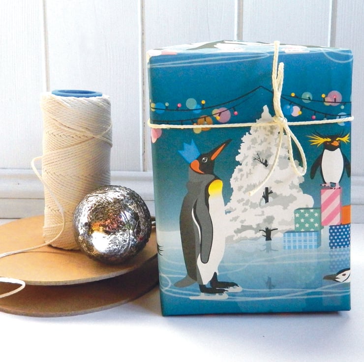 A magical Christmas Penguin Party gift wrapping paper with six different species of penguins ice-skating around a white Christmas tree - Premium, eco friendly, matt gift wrap sure to make any Christmas gift look amazing! A great choice for a more sustainable, eco friendly Christmas.