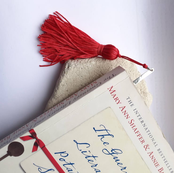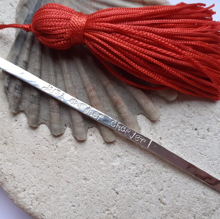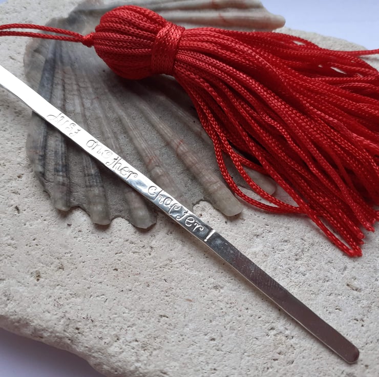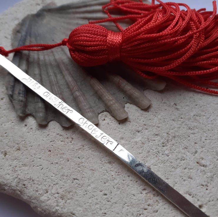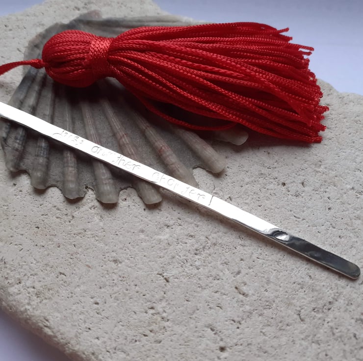 Handmade recycled sterling silver book mark with hand stamped lettering, topped off with a bright red tassel to help you keep track of your place in your favourite book.
