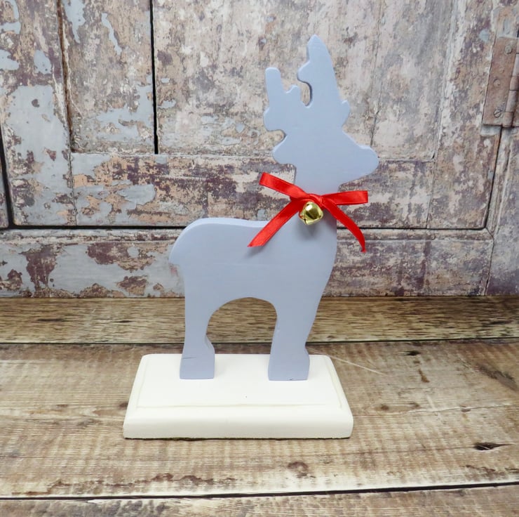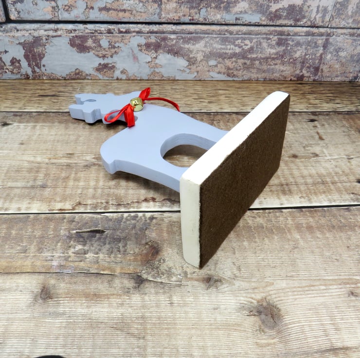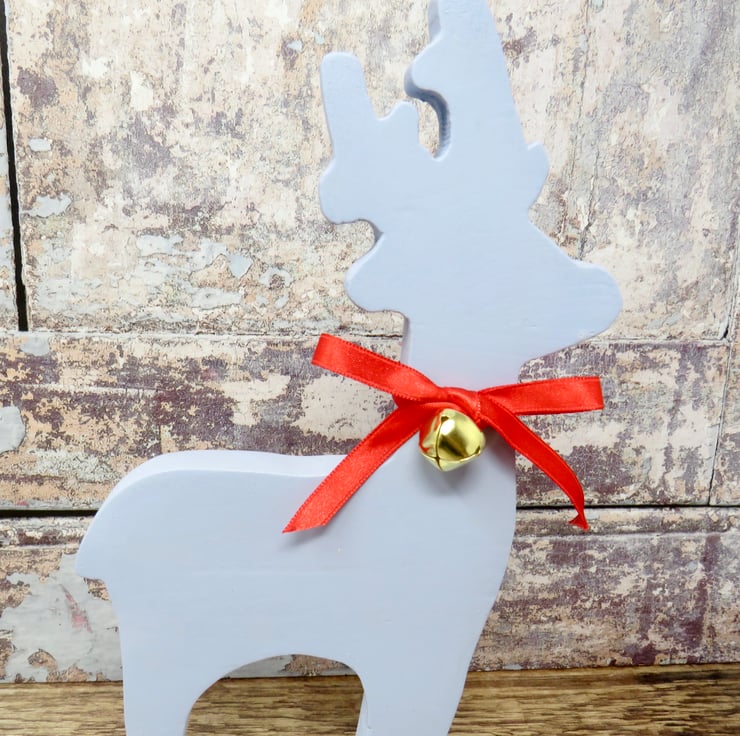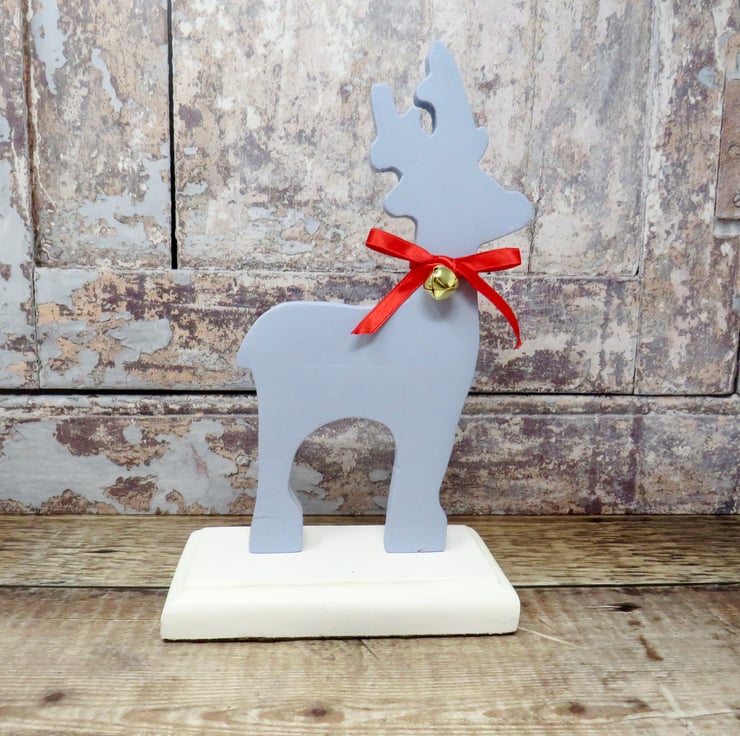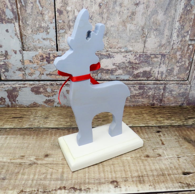 Blue wooden reindeer ornament decorated with red ribbon and a brass bell. Mounted on a white base it would add Christmas cheer to any home. Felt has been added to the base to protect surfaces. The reindeer has been painted with chalk paint and varnished to protect again scratches .
