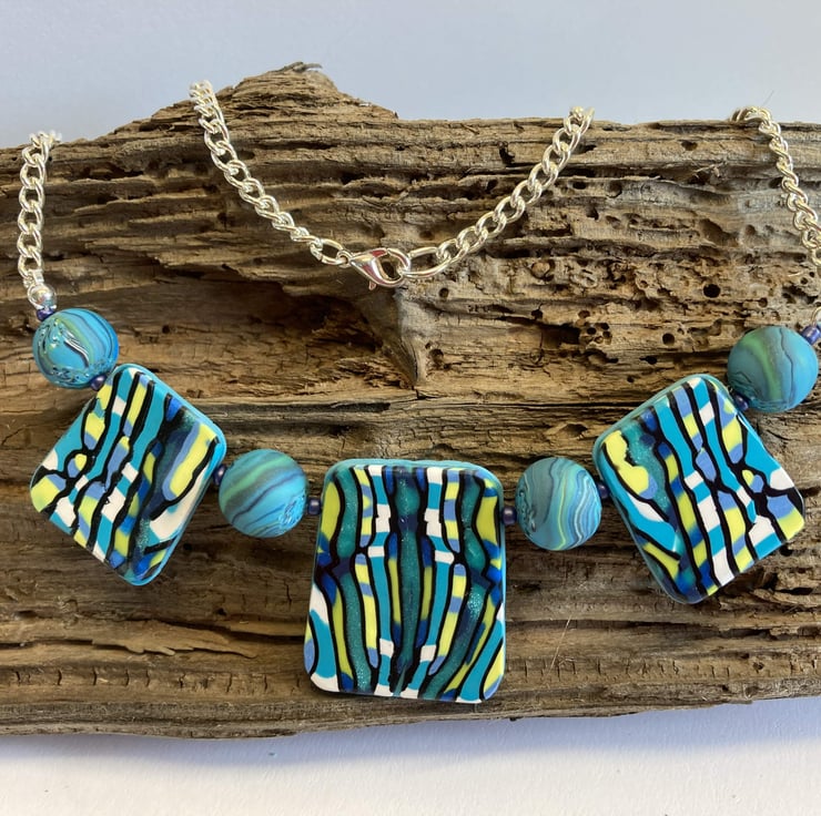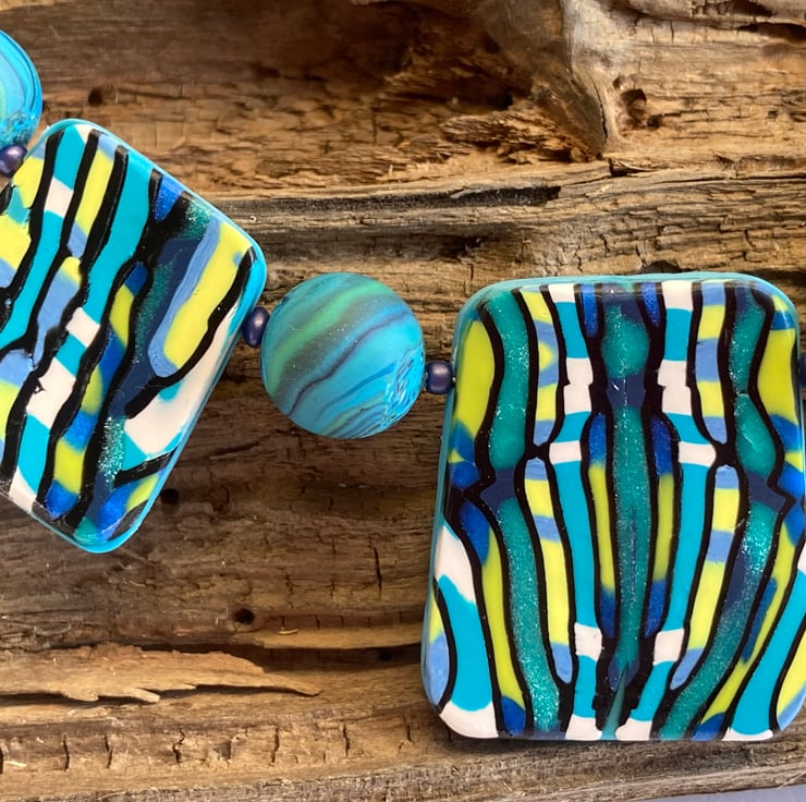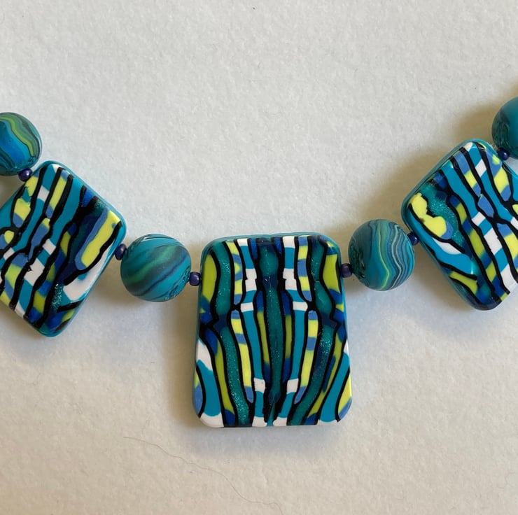 This necklace has been made using the Stroppel cane technique. The process involves creating canes which are thinly sliced and applied to the background sheet of clay.