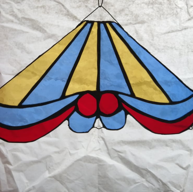 This colourful Circus Carousel Top shaped glass piece makes a cheerful, playful suncatcher. It is made as an accompanying piece to my stained glass horses or acrobats made with the same circus colours. Each top has 3 hooks on the bottom, so 1, 2, or 3 horses or acrobats can be hung from it. It is sized 20cm x 15 cm.