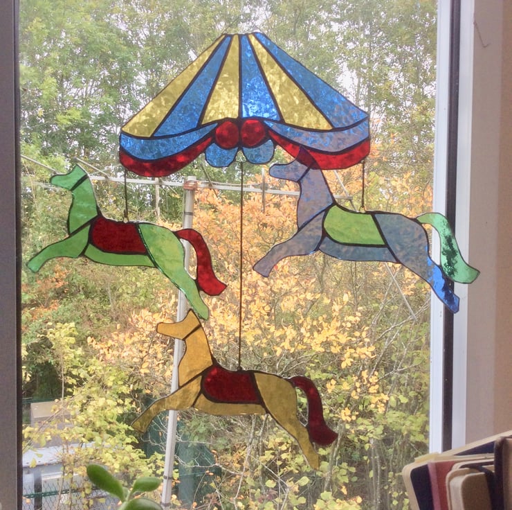 This colourful Circus Carousel Top shaped glass piece makes a cheerful, playful suncatcher. It is made as an accompanying piece to my stained glass horses or acrobats made with the same circus colours. Each top has 3 hooks on the bottom, so 1, 2, or 3 horses or acrobats can be hung from it. It is sized 20cm x 15 cm.
