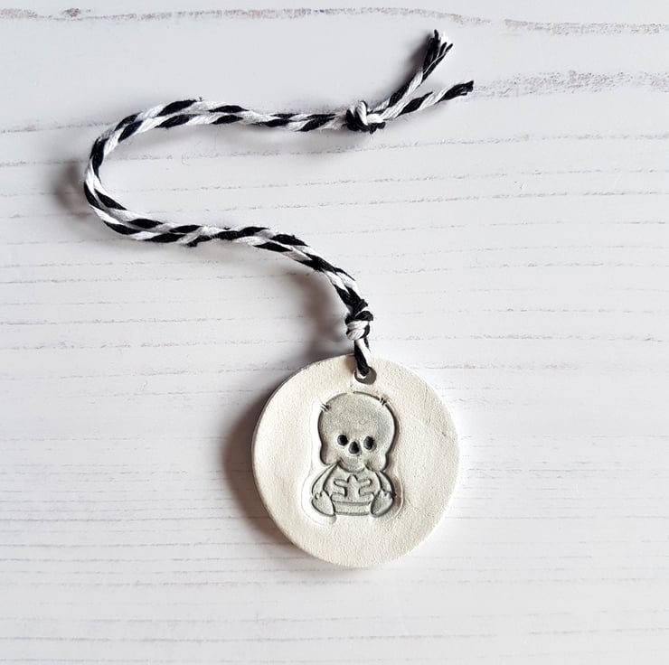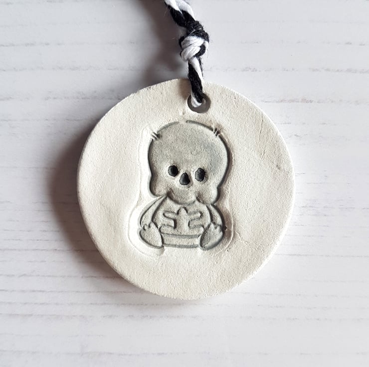 The design is hand stamped into air dry clay, then finished off using a dryer, and finally hand painted detail added using acrylic paint. The piece is then sealed with a varnish to protect, with some baker's twine added to hang in your home!