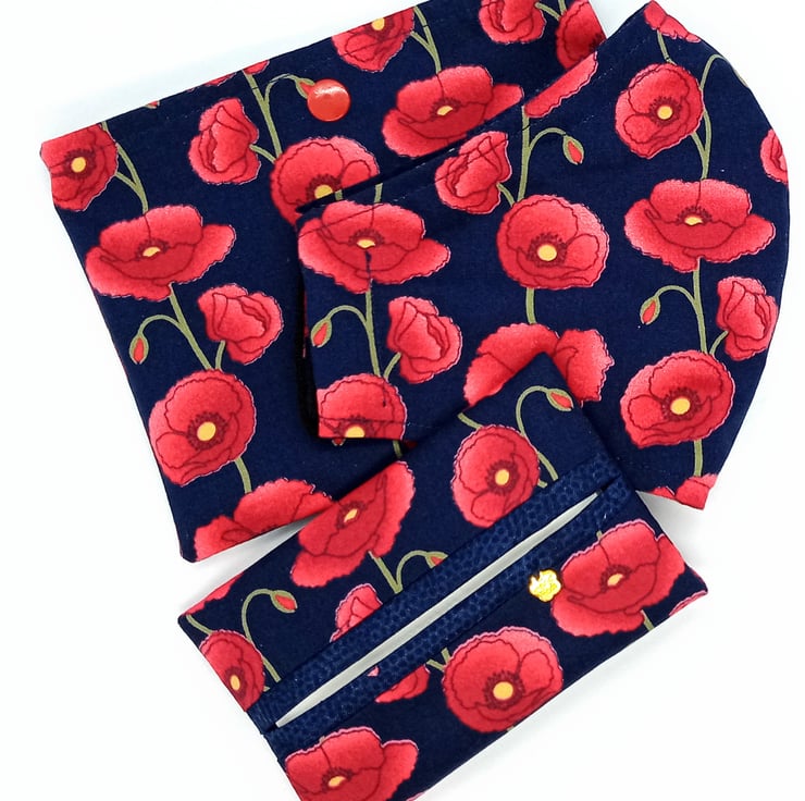 A face mask and pouch to store your mask while not in use. It is made from 100% cotton and should be washed regularly after use