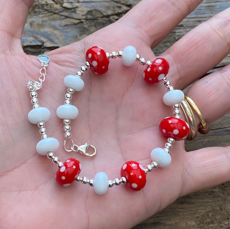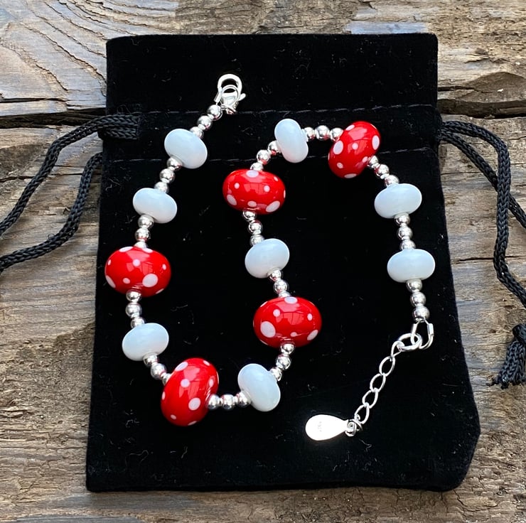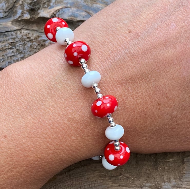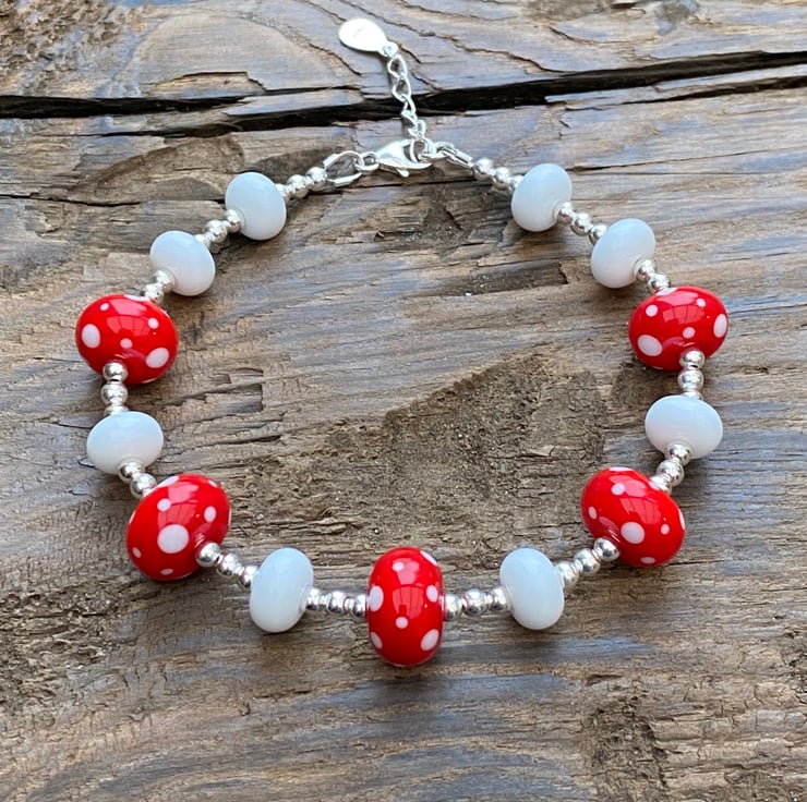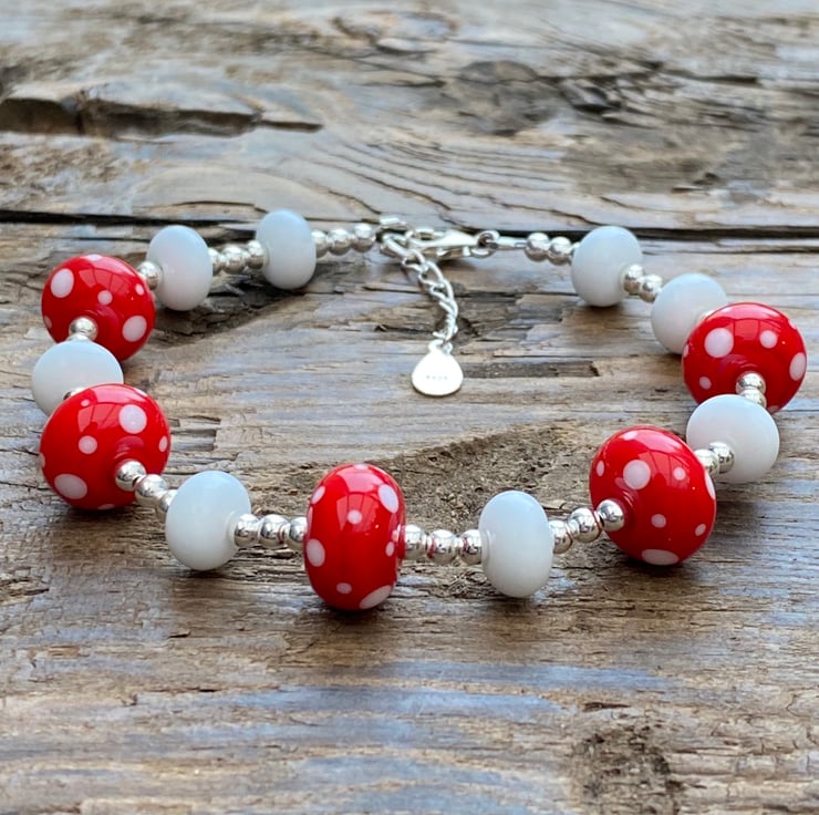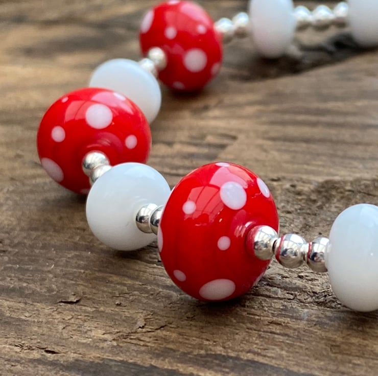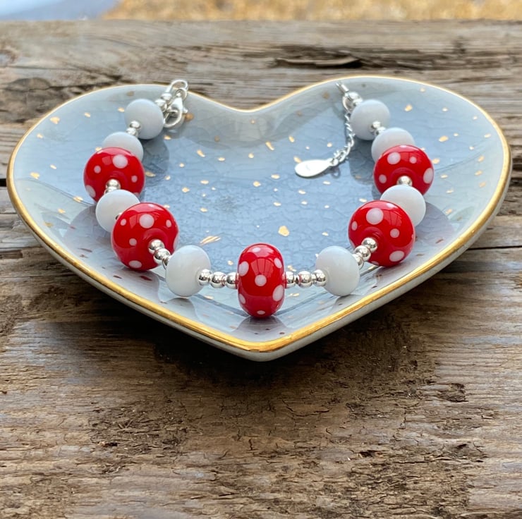This stunning statement bracelet has been made using 5 bright red and white spot lampwork glass beads and white lampwork spacer beads.