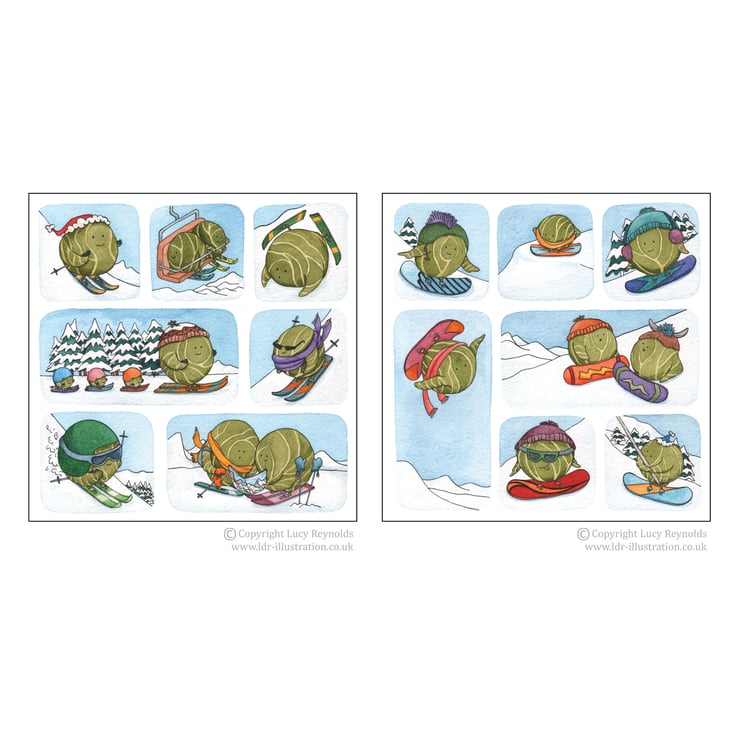 Pack of twelve cards (two designs) comprising six 'Skiing Sprouts' and six 'Snowboarding Sprouts'