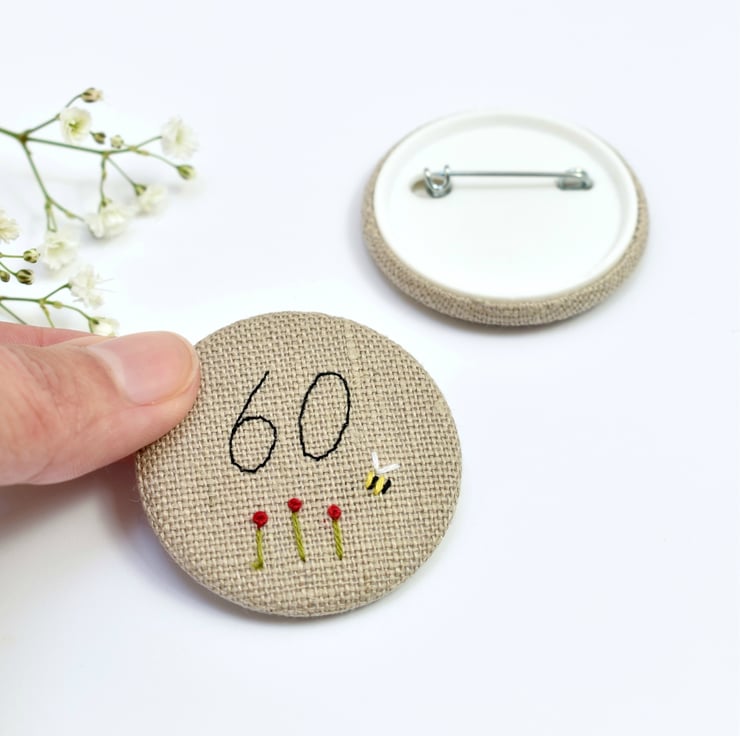 This simple but elegant embroidered 60th birthday pin badge is made from natural linen fabric. The birthday age is embroidered using freehand machine embroidery and the tiny flowers and small bee are delicately sewn by hand.