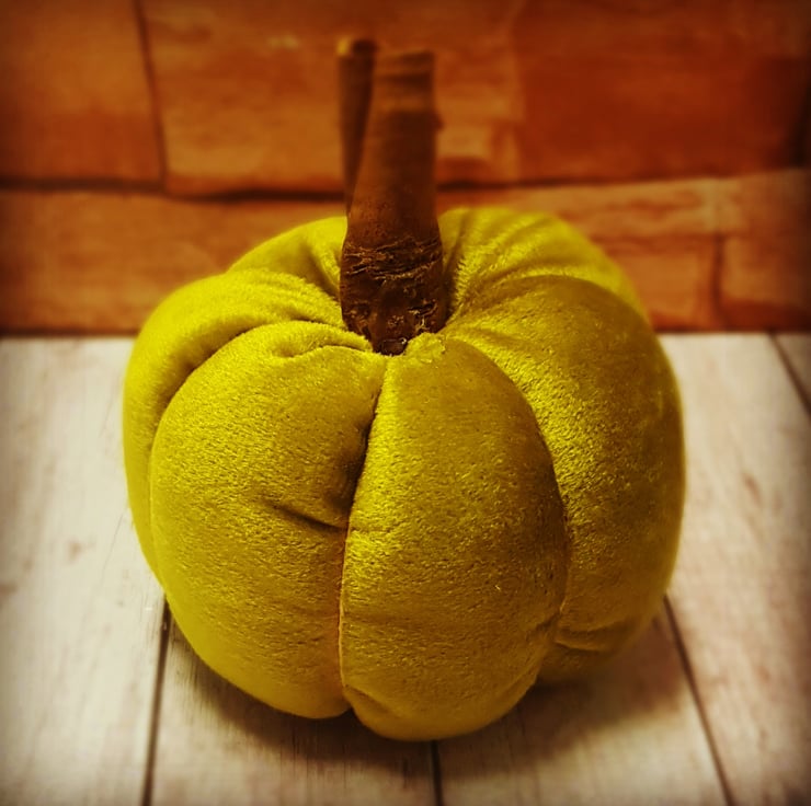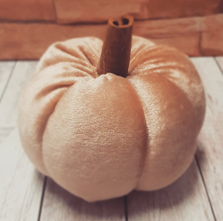 Sumptious velvet pumpkins with cinnamon stems. Various shades available.