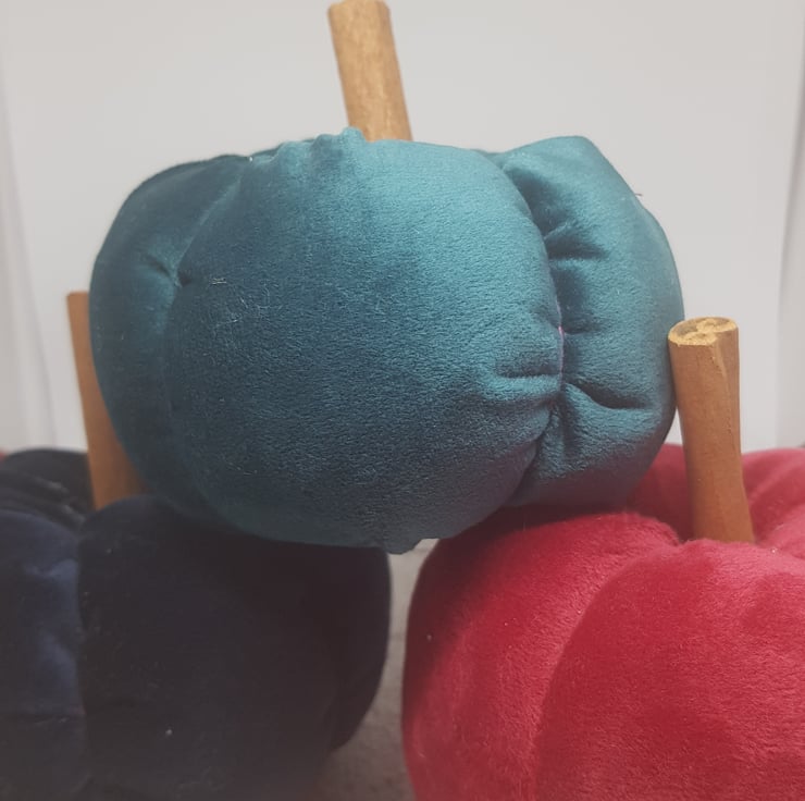 Sumptious fall decorations with a practical twist. Also a pin cushion. The change of seasons means different textures. Usually Dottys designs are linen but in the fall they change to heavier fabrics and lush, rich velvets.